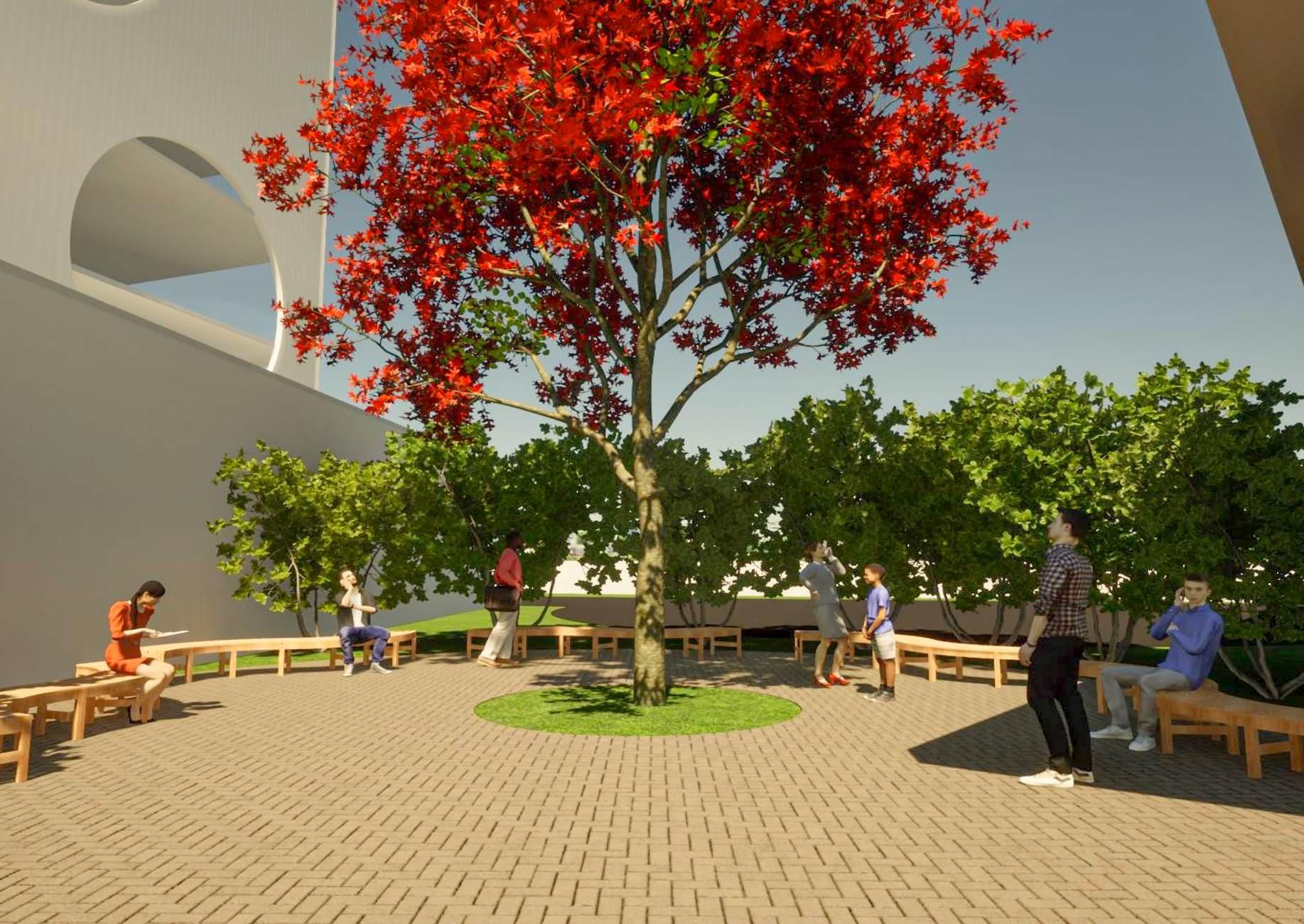 The use of tall trees with dense canopies in outdoor interactive spaces like at the vendors zone.