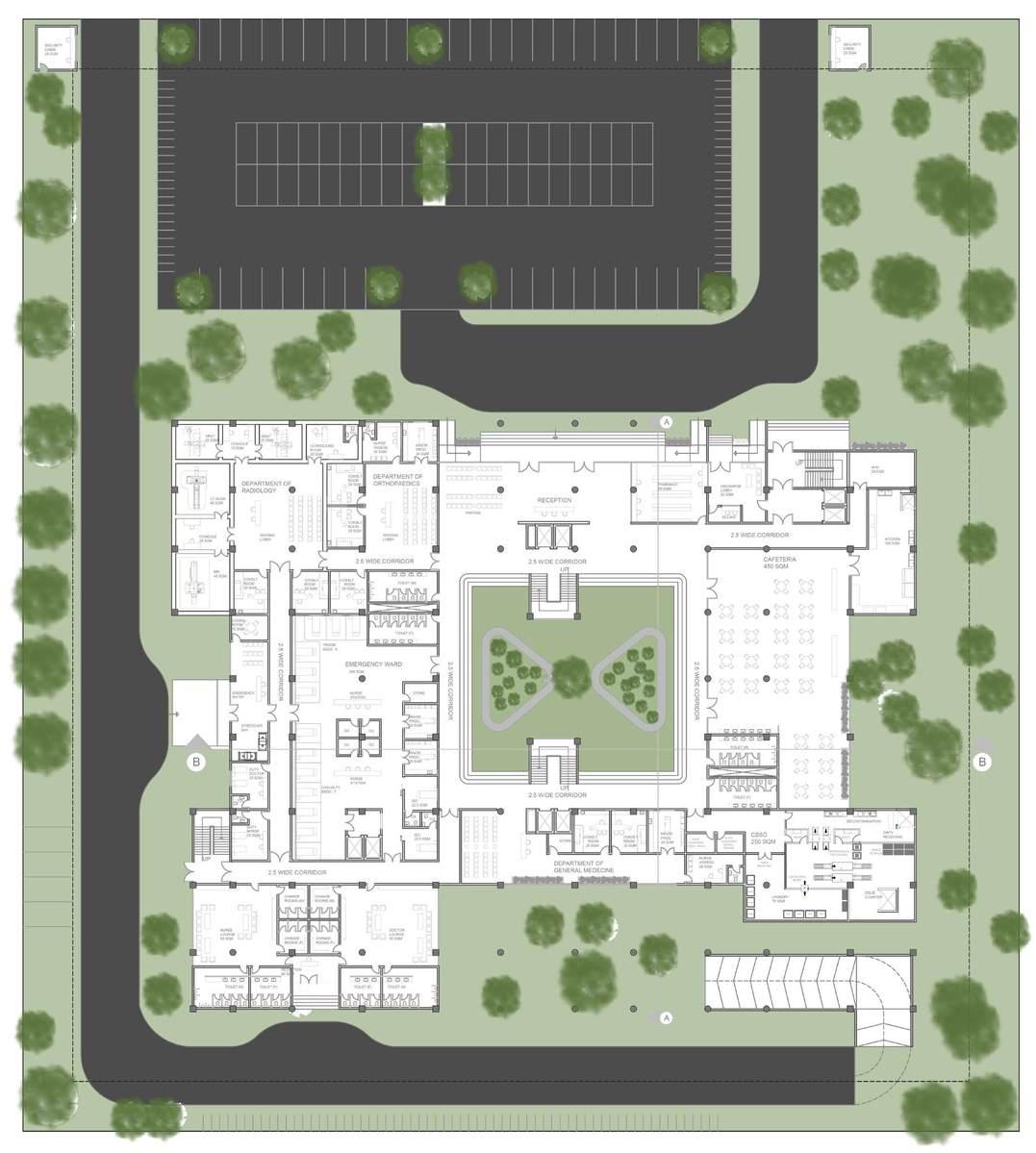 The ground floor receives the maximum traffic with respect to the OPDs, emergency and cafeteria. The CSSD and laundry are located on this floor while other services are located in the basement and service floors.