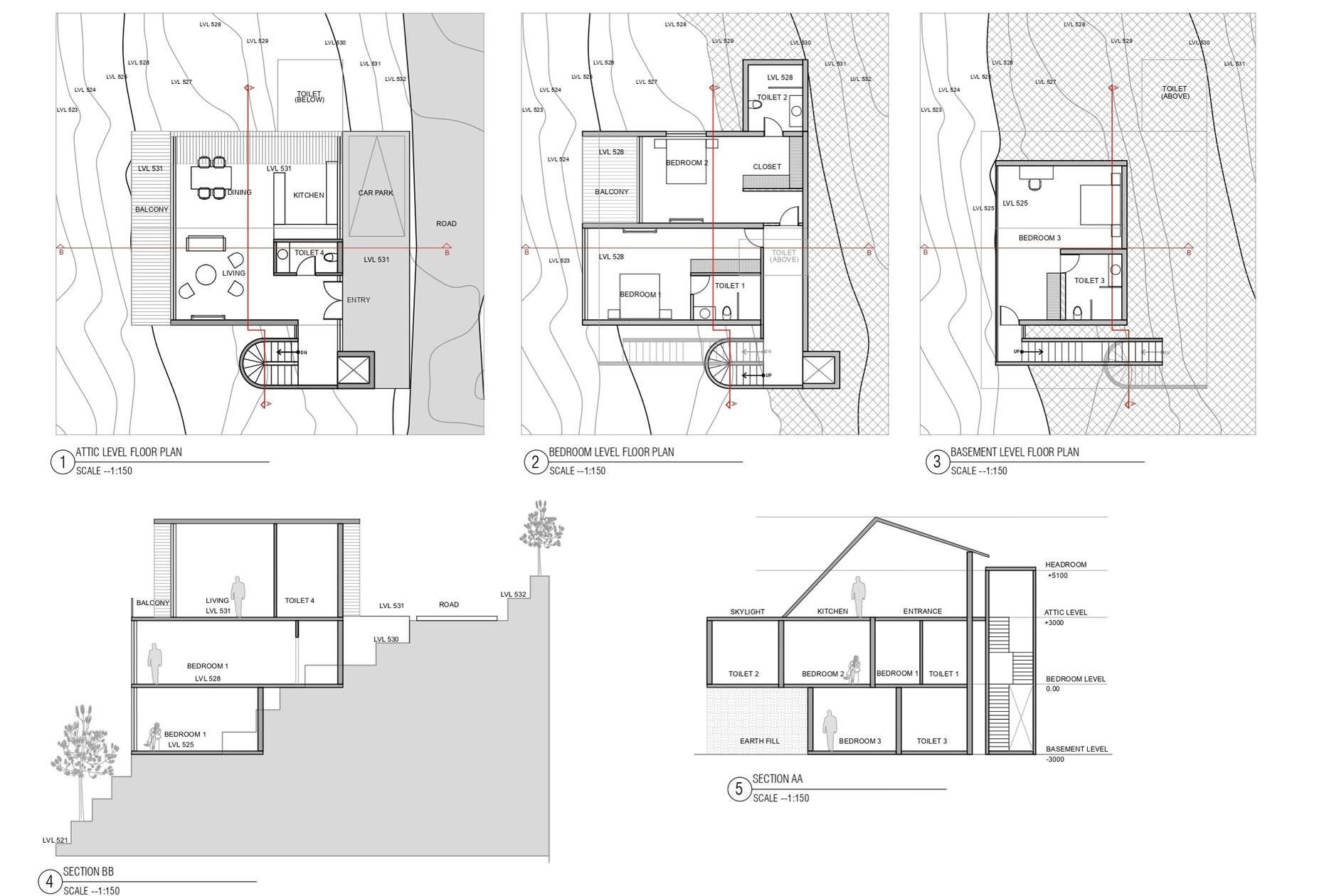 As the site is located on a stepped contour, the design adapts to the site features to create stepped terraces on each floor. These terraces are on the north direction providing glare free daylight throughout the building.