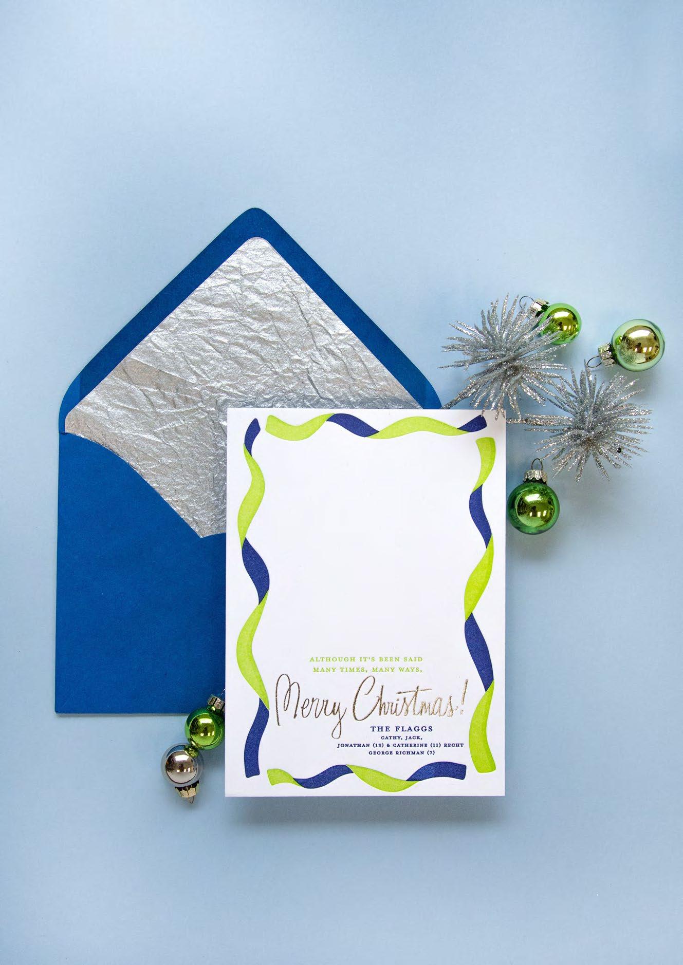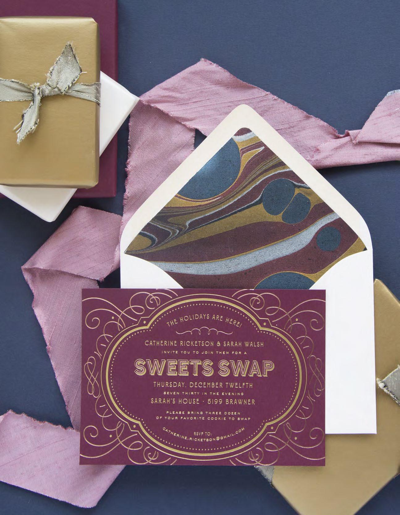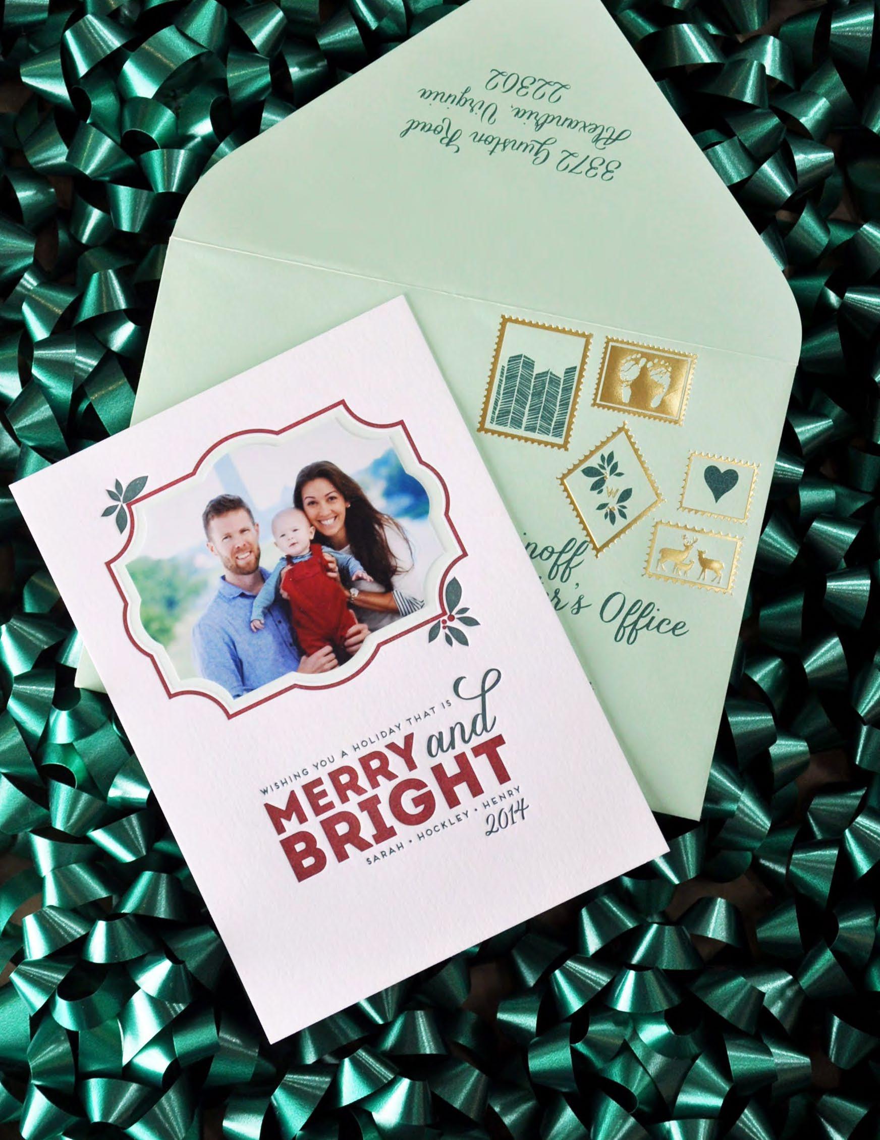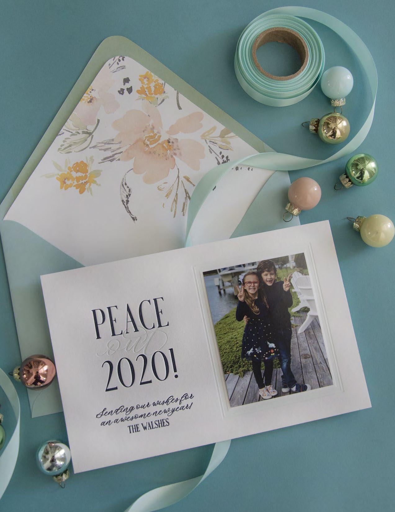 one color foil stamp + one color letterpress with space for a photo shown with custom liner and one color foil stamp return address