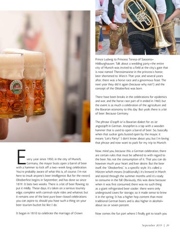 very year since 1950, in the city of Munich, Germany, the mayor busts open a barrel of beer with a hammer to kick off a two-week long celebration. You’re probably aware of what this is, of course. I’m not here to insult anyone’s beer intelligence. But for the record, Oktoberfest begins in September, and has done so since 1819. It lasts two weeks. There is a lot of beer flowing, to put it mildly. These days, it’s taken on a serious touristy edge, complete with carnival-style rides and whatnot, but it remains one of the best pure beer-based celebrations you can aspire to, should you have such a thing on your beer tourism bucket list like I do.