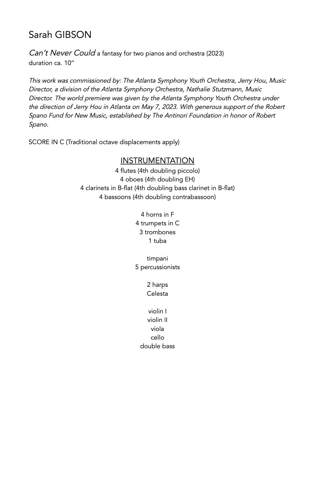 Can’t Never Could is a fantasy for two pianos and orchestra. As an alumna of the Atlanta Symphony Youth Orchestra I was the orchestral pianist I had a blast thinking about what sort of orchestral colors, techniques, or ideas would have excited me as a young composer sitting in the middle of an orchestra during rehearsals and performances. WIth this in mind, I decided to give each instrumental family a virtuosic section which challenges what one might normally do in traditional repertoire. These changes in orchestration trigger the changes in form as the duo pianists (my piano duo, HOCKET) interact in fantastical flourishes around the orchestral material.