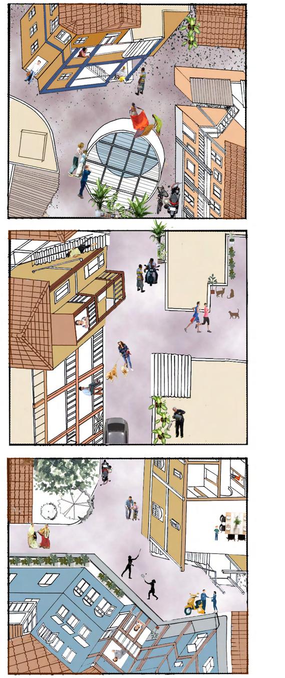 semi-open spaces that blur the boundaries between indoor and outdoor environments, facilitating natural ventilation and visual connections. These spaces will be flexible enough to accommodate a variety of activities, from daily chores to cultural celebrations, fossense of community. By providing platforms for interaction and shared experiences, the design seeks to activate the space and empower residents to shape their social environment collaboratively.