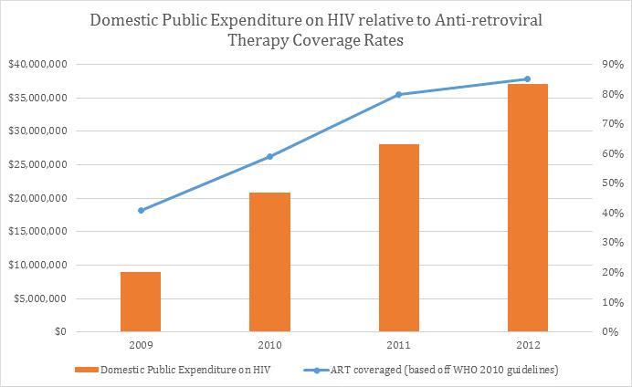 Funding from external donors, however, is not the sole source of support in Kenya’s fight against AIDS. In 2012, government expenditures for health made up 4.7 percent of its total GDP.32 Though well below the Abuja Declaration target of 15 percent, the government, in particular the Ministry of Finance and the Ministry of Health, has expressed willingness to increase contributions for health.
