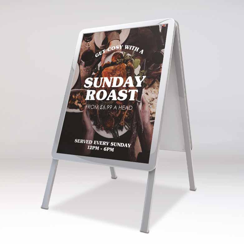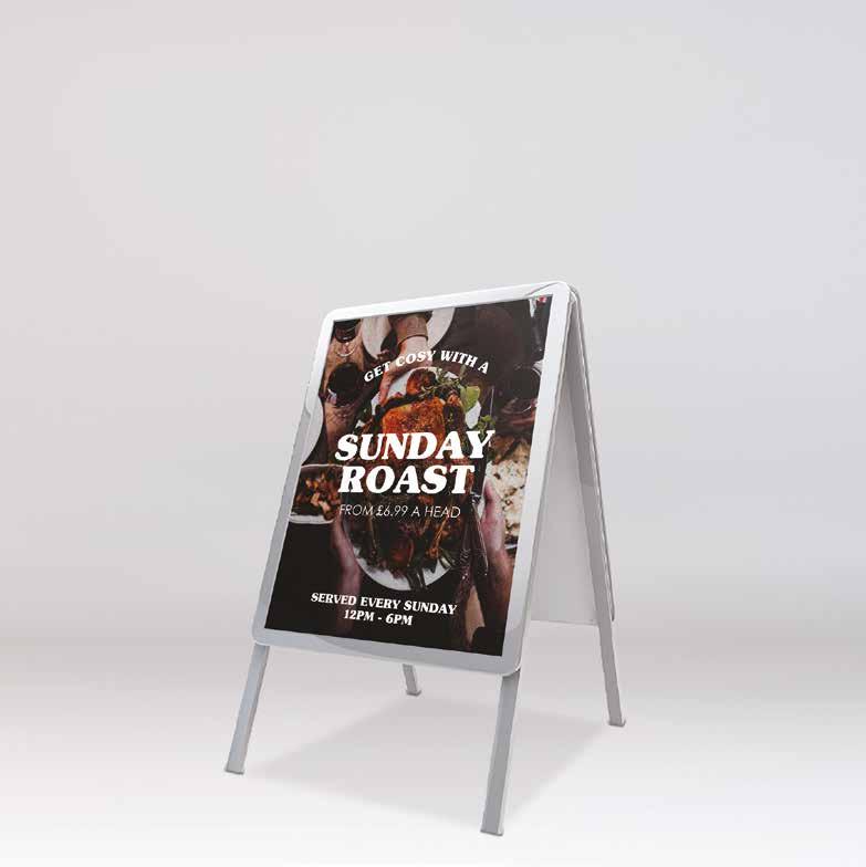 An A-frame can draw attention to your business premises from afar and get those important clients to come and say hello. Our silver A-frames are made from aluminium and steel with a transparent anti-glare cover. They fold away for space saving night time storage and the snap frame ensures you can change the graphics with ease. All A-frames are supplied with two 220mic PVC posters as standard.