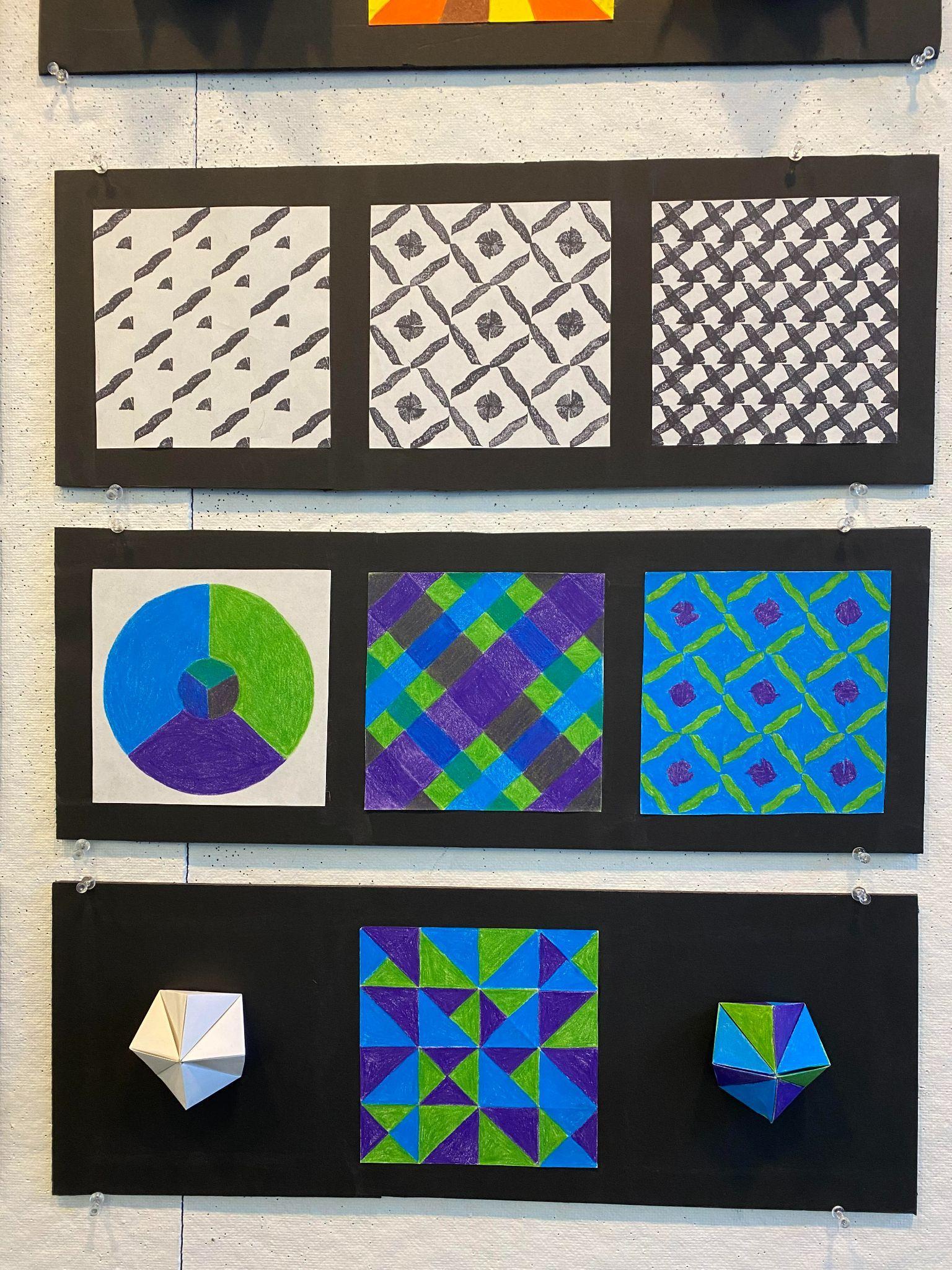The goal of this project was to explore the possibilities of a stamp in various different orientations and color schemes. The objective was to carve a simple pattern into a linoleum block and for the first board have three different patterns; detached (original stamp design carved), touching, and overlapping. For board 2, the objective was to make a color wheel for the color scheme of the overall project through primary and secondary colors. Next a layered plaid pattern had to be designed using the colors and finally recreate one of the stamps with the color scheme. The third board objective was to take a single piece of paper and make a texture design, then take that folded pattern and color it, and finally have the color scheme on the paper and have a folded version again. The overall concept to learn through this design was the ways to manipulate patterns through changes in the direction it is placed, color. and materials.