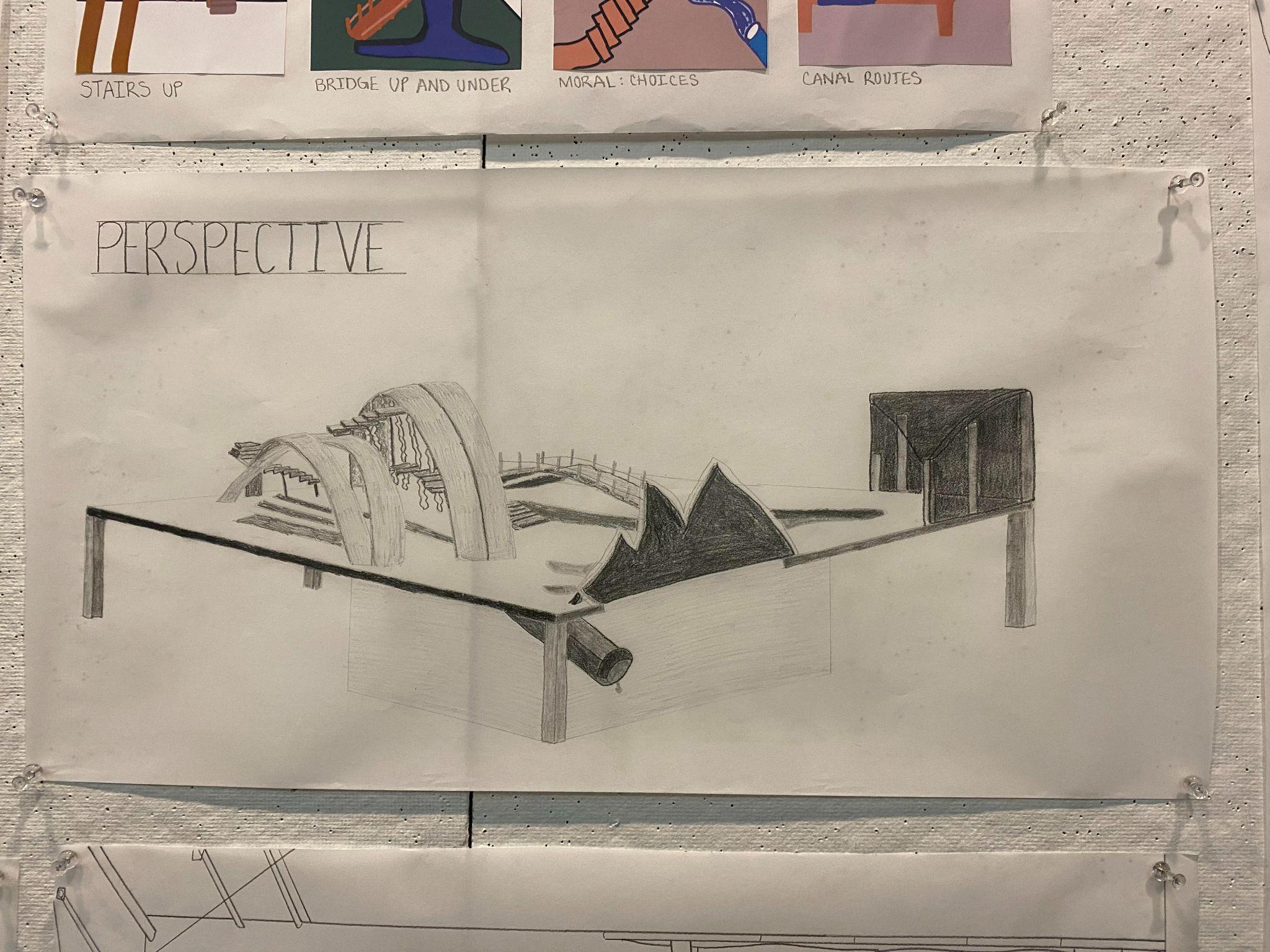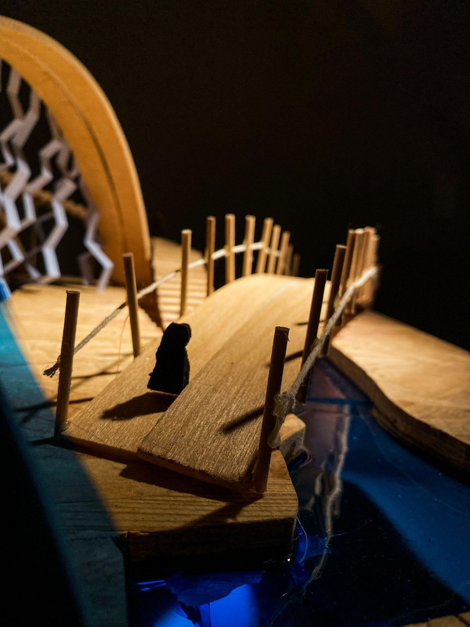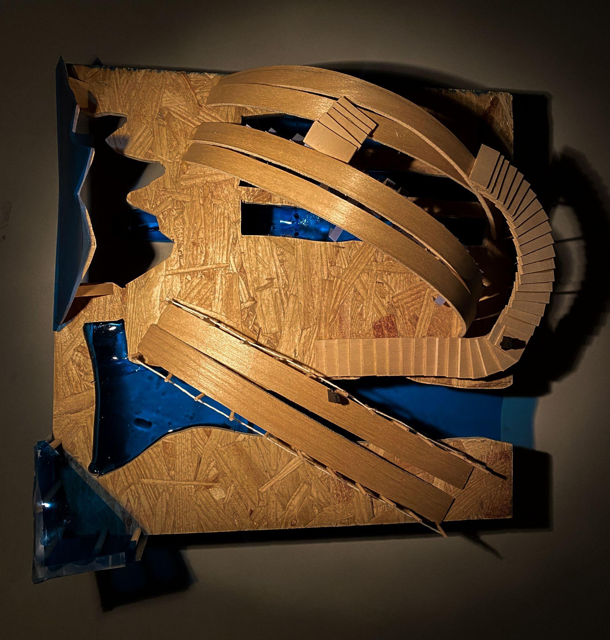 This part of the project’s goal was to make the wooden model into a city. First a city from the book Invisible Cities by Italo Calvino was chosen. The city chosen here was Esmeralda, which is a city involving water with various routes. Next one had to build the city by using the components from the reading and incorporating it into what was added onto the original wooden model. Since Esmeralda has many routes, stairs, slides, bridges and waterways, different materials and more wood was added for the various different routes across land and water to come to life. The city scale was kept in mind when constructing as a person could live in the city. The scale used was ⅜”=1’.