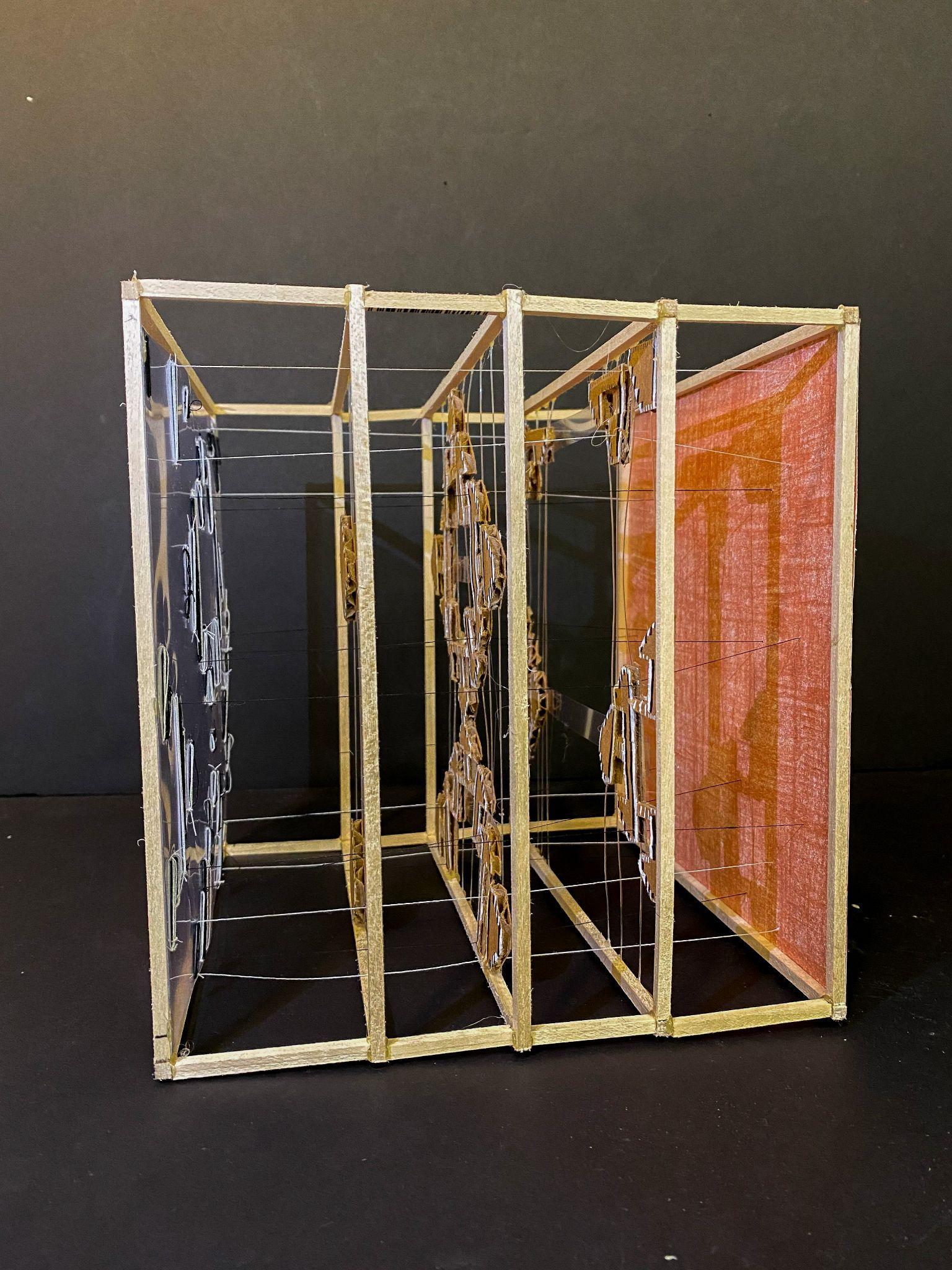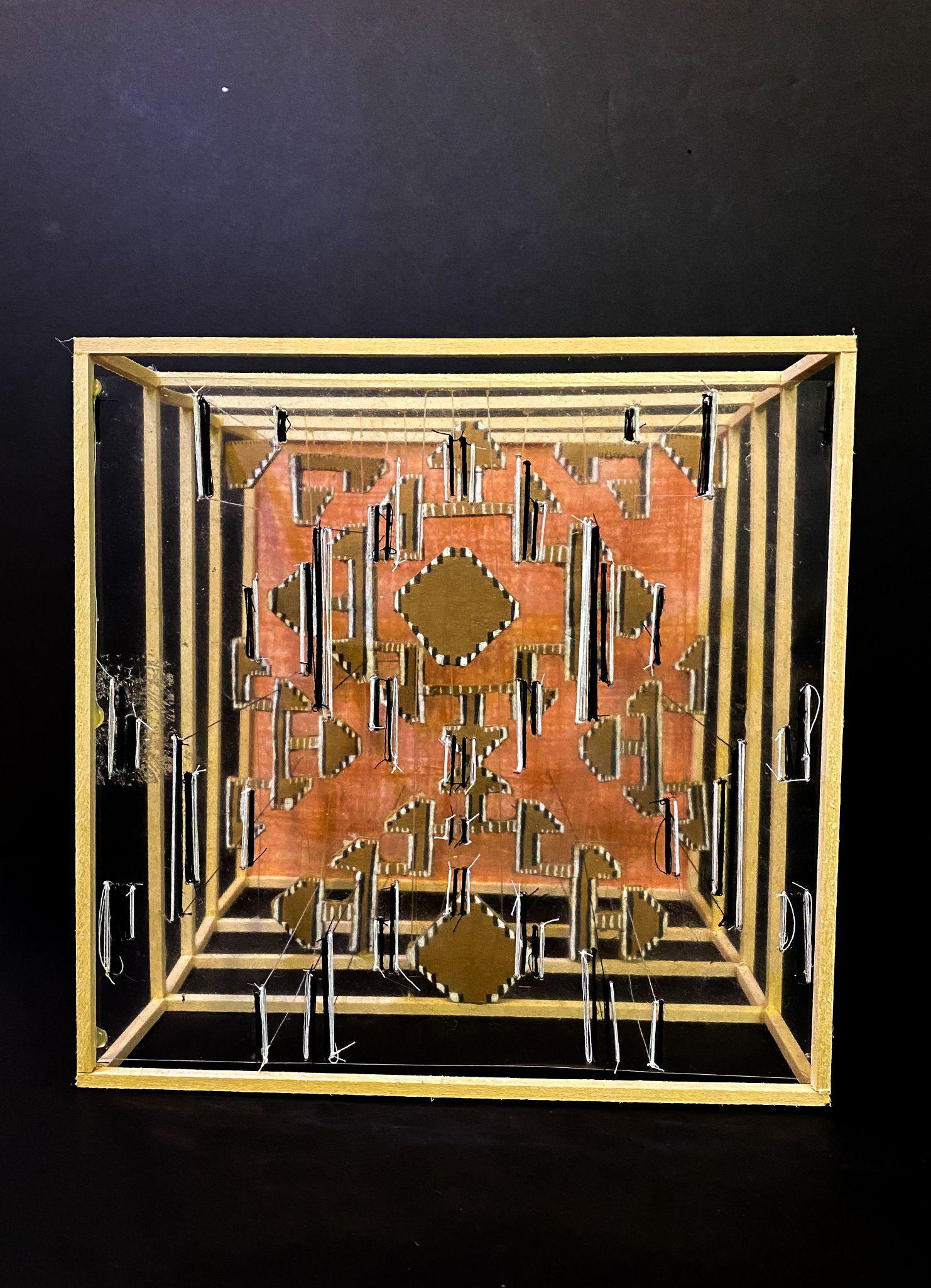 This project’s goal was to use the idea of hierarchy and how to transform a 2D textile and recreate it into a 3D abstract design model. The textile chosen was specifically a Navajo Woven Rug. First 6 diagrams analysing the pattern was drawn out to understand the textile components that compose it. Next a 2D model was created using those concepts. Finally using the diagrams and concepts from the 2D model, a 3D model was constructed to demonstrate the hierarchy. The 3D model showed the textile broken apart into different sections and how these layers together make up the pattern when looking at it.