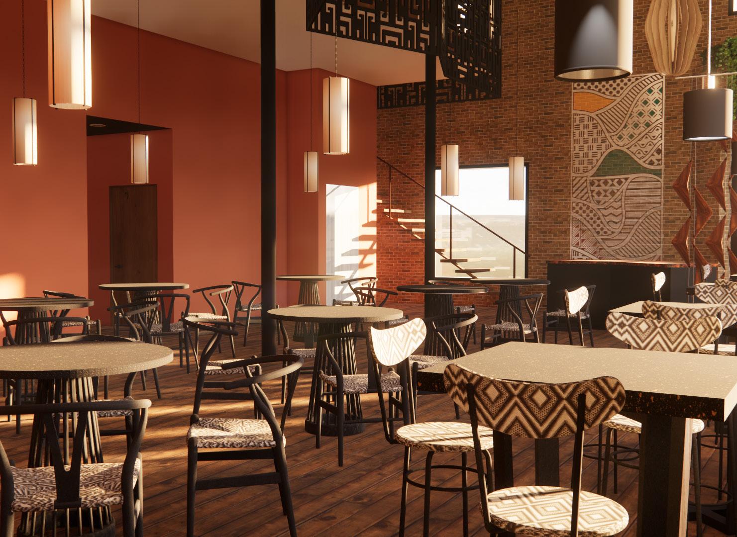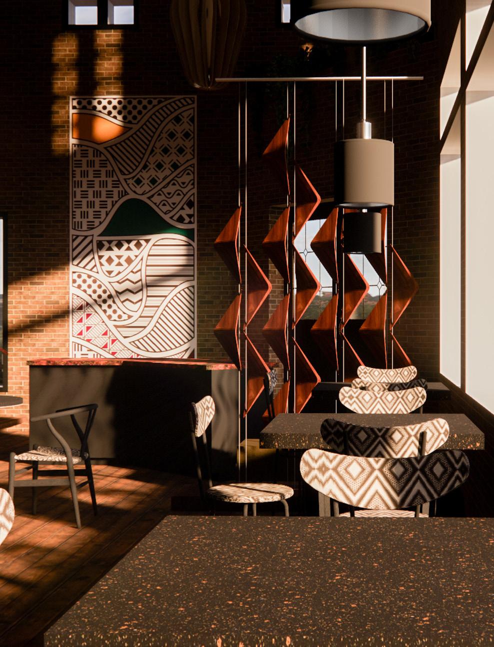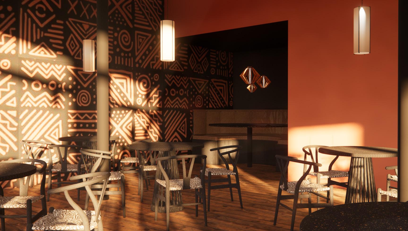 West African culture is full of community, life, movement, and dance. By incorporating these factors, the design invokes a safe place full of cultural comfort that brings pride through bold patterns, decor, and colors.