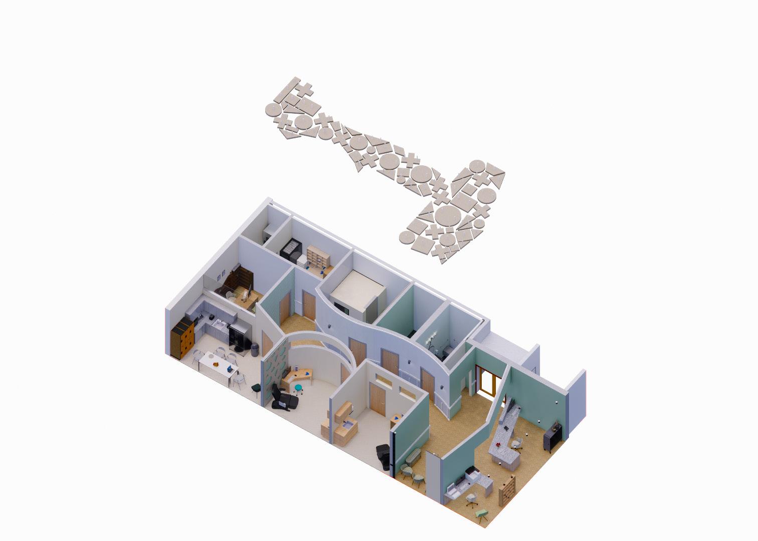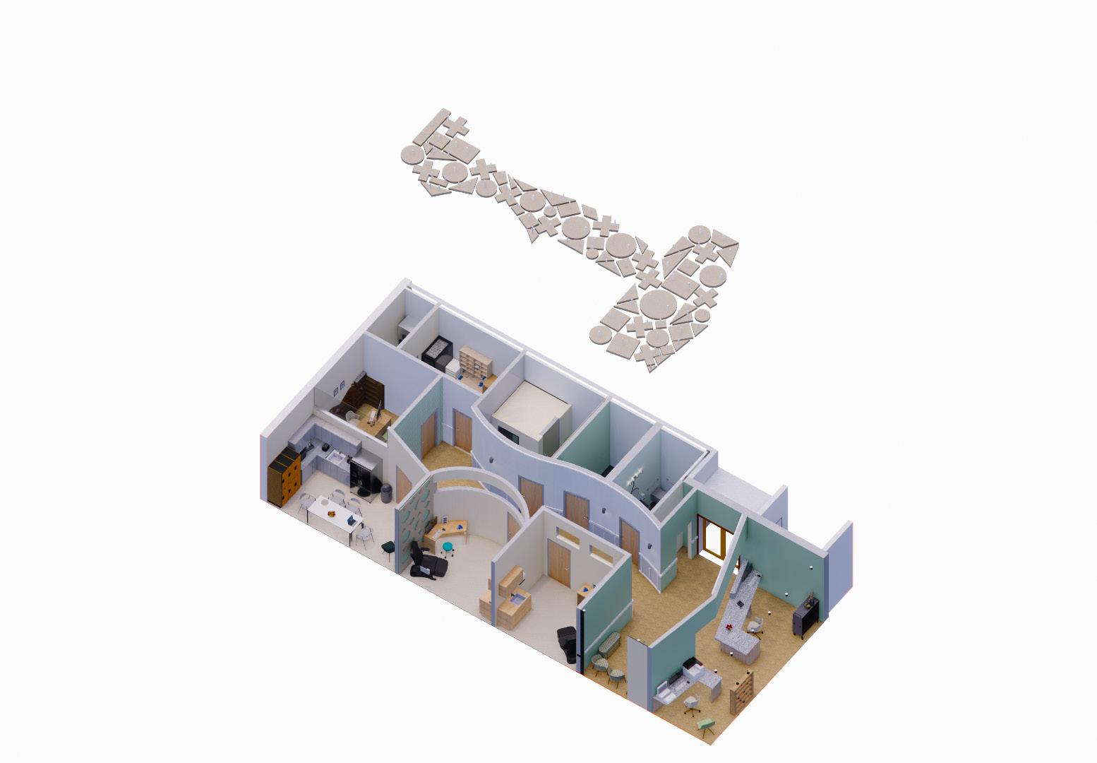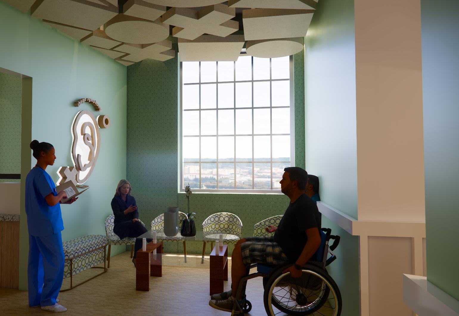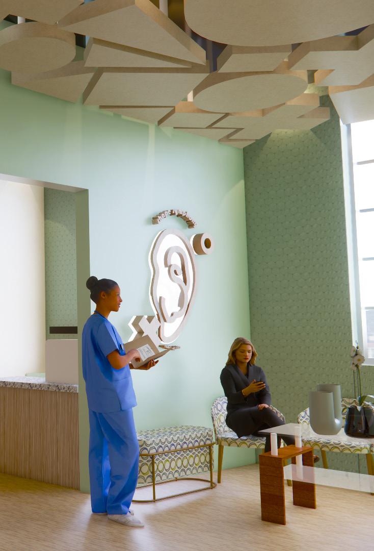 This study model was focused on the different shapes of the Audiometer Test and incorporated these shapes into the room designs. This concept was also incorporated into the acoustical ceiling design and on the acoustic panels in the exam rooms.