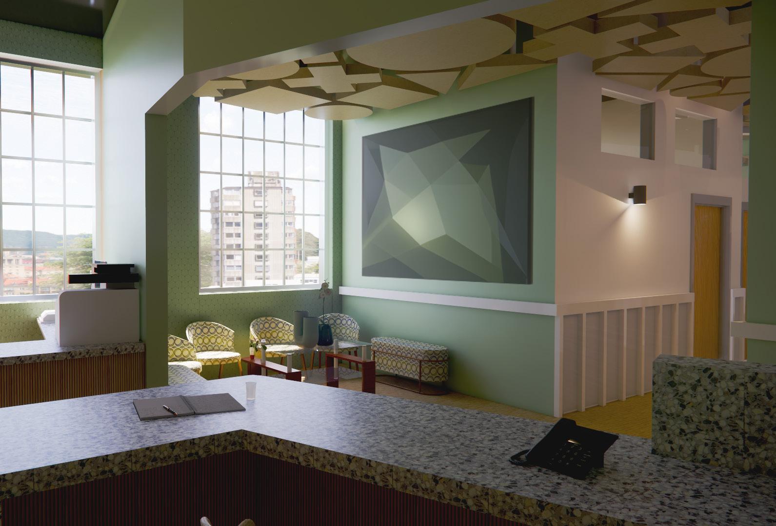 PERSPECTIVE OF RECEPTIONIST AND WAITING ROOM AREA