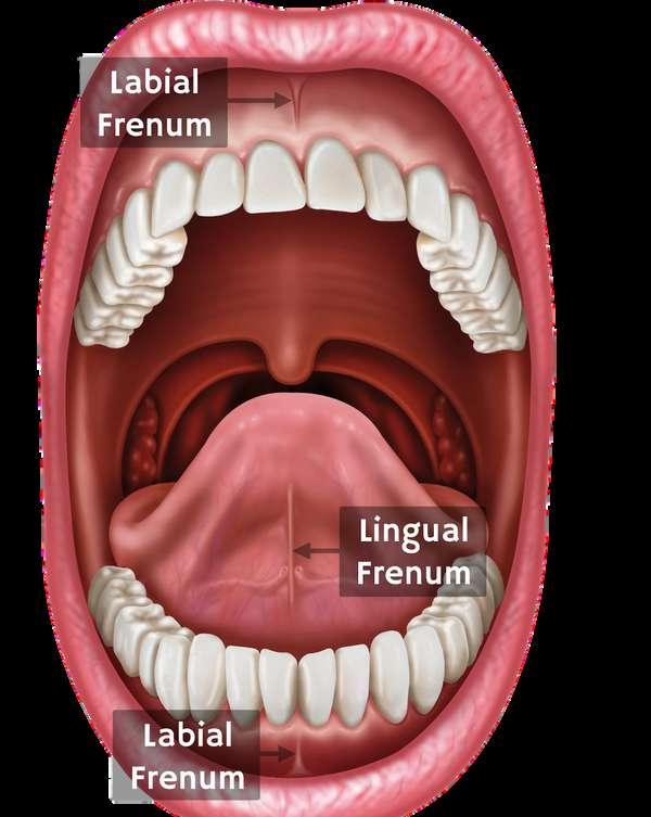 Bagian depan lidah atau disebut juga dengan lingual frenulum, sedangkan bagian belakang lidah disebut dengan tulang hyoid. Kondisi inilah yang memungkinkan lidah mampu mengunyah, membolak-balikan makanan, menelan makanan, dan berbicara.
