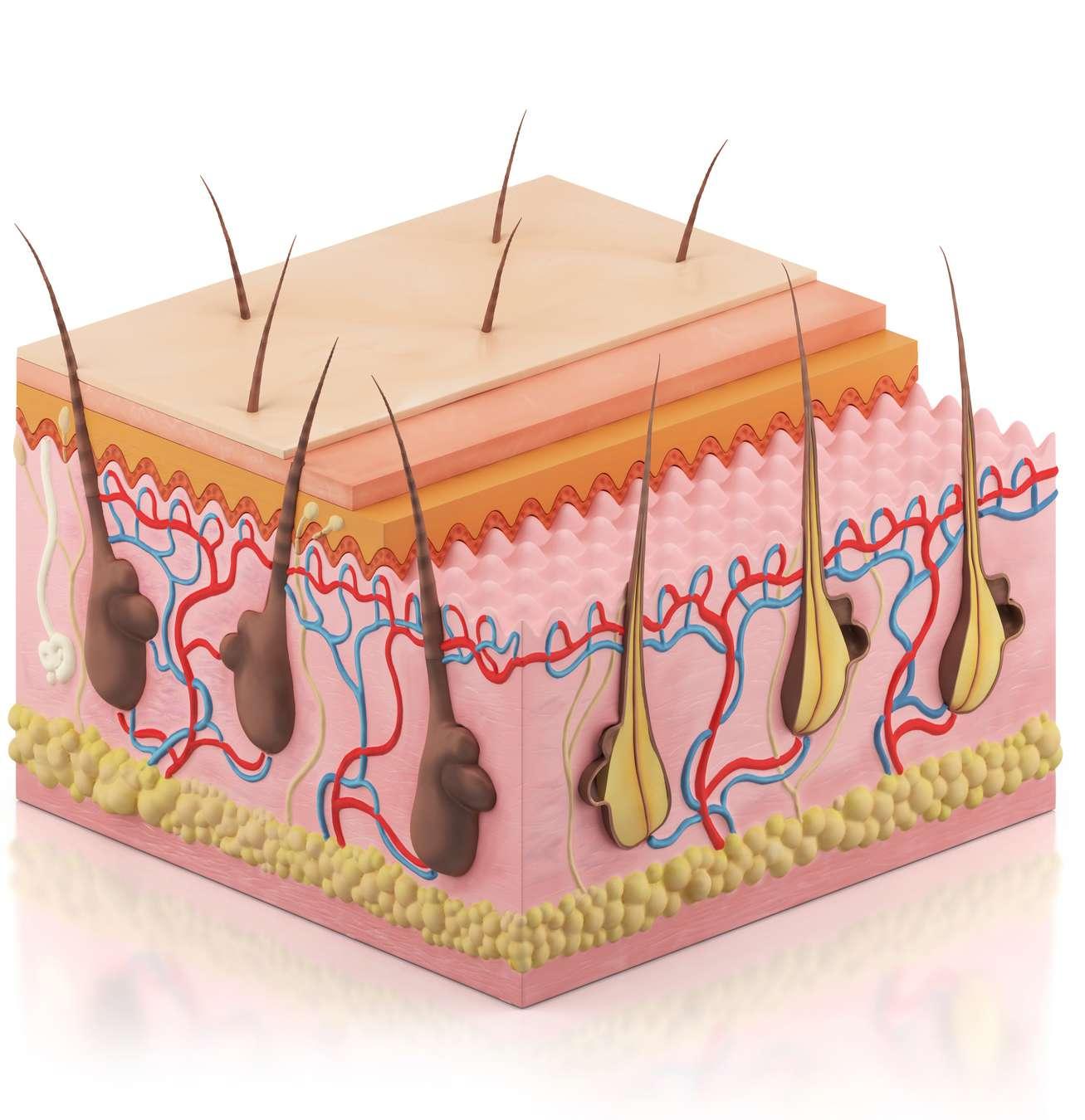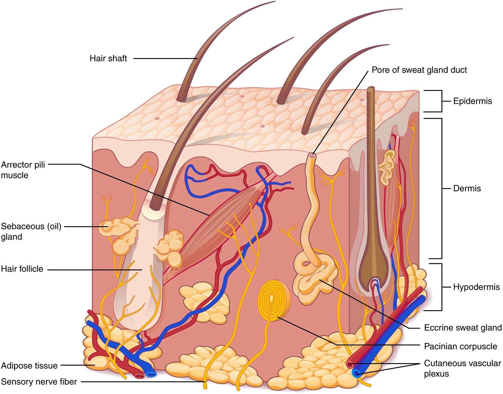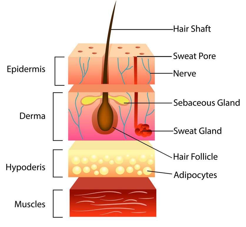 Dermis merupakan anyaman serabut kolagen dan elastin yang berperan untuk sifat- sifat penting pada kulit. Ketebalannya kira kira 3 5 mm 1) Ujung saraf peraba. 2) Pembuluh darah. 3) Otot penegak rambut 4) Folikel rambut.