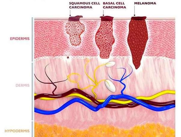 Karsinoma sel basal, jenis kanker kulit yang berasal dari sel yang ada di bagian paling dalam dari lapisan kulit yang paling luar atau epidermis. Karsinoma sel skuamosa, jenis kanker kulit yang berasal dari sel yang ada di bagian tengan dan paling luar dari epidermis. Melanoma, jenis kanker kulit yang berasal dari sel yang berfungsi untuk menghasilkan pigmen kulit atau melanosit.