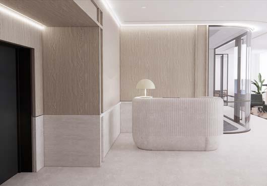 Soft hidden lighting to follow curve Timber and stone paneling in lobby surround Stone floor finish to bleed onto wall panelling Feature light in bronze and HILLHOUSE signage to match singapore design M Moser Associates - Hillhouse Investment 7