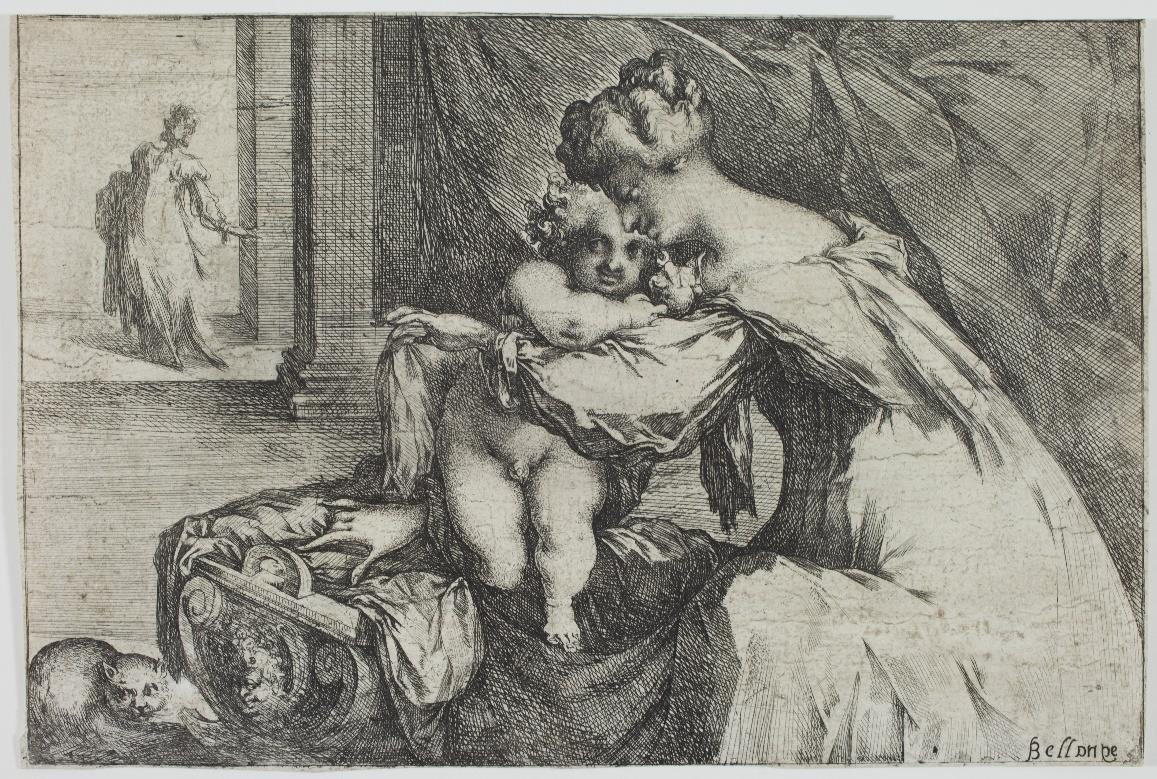 “The depiction of the Virgin with a cradle and a distant figure, often seen through a doorway and identifiable as Joseph, occurs in numerous late sixteenth- and seventeenth-century prints of the Holy Family in Egypt (for example, Jan Sadeler after F. Sustris, Hollstein 303). […] Although the identification of the distant figure as Joseph is reasonably inferred from other prints of this subject, he is here rather enigmatic, to say the least, resembling the mysterious figures wandering anonymously about in the background of Bellange’s larger prints.” (Antony Griffiths and Craig Hartley: Jacques Bellange, c. 1575 - 1616, Printmaker of Lorraine, 1997, p. 60).