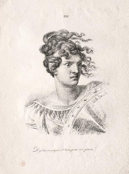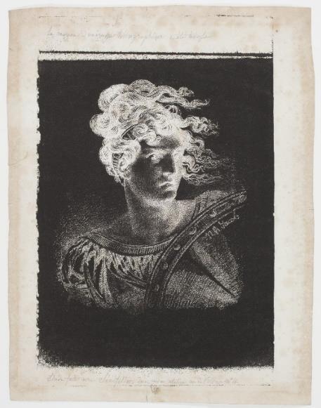 Aloys Senefelder invented lithography in 1796 in Munich. In 1819, he printed in Paris the French translation of the treatiseThe Art of Lithography (Vollstandiges Lehrbuch der Steindruckerei) published the previous year in Munich and Vienna. The same year, the work was enriched by a collection of twenty lithographic plates: Collection de plusieurs essais en dessins et gravures pour servir de Supplément à l'Instruction pratique de la Lithographie by Aloys Senefelder. These are examples, some executed by Senefelder himself, of lithographs reproducing pencil or pen drawings, etchings or woodcuts or musical scores. The Head of an Amazon in its usual versiont is plate XIV of this Collection.