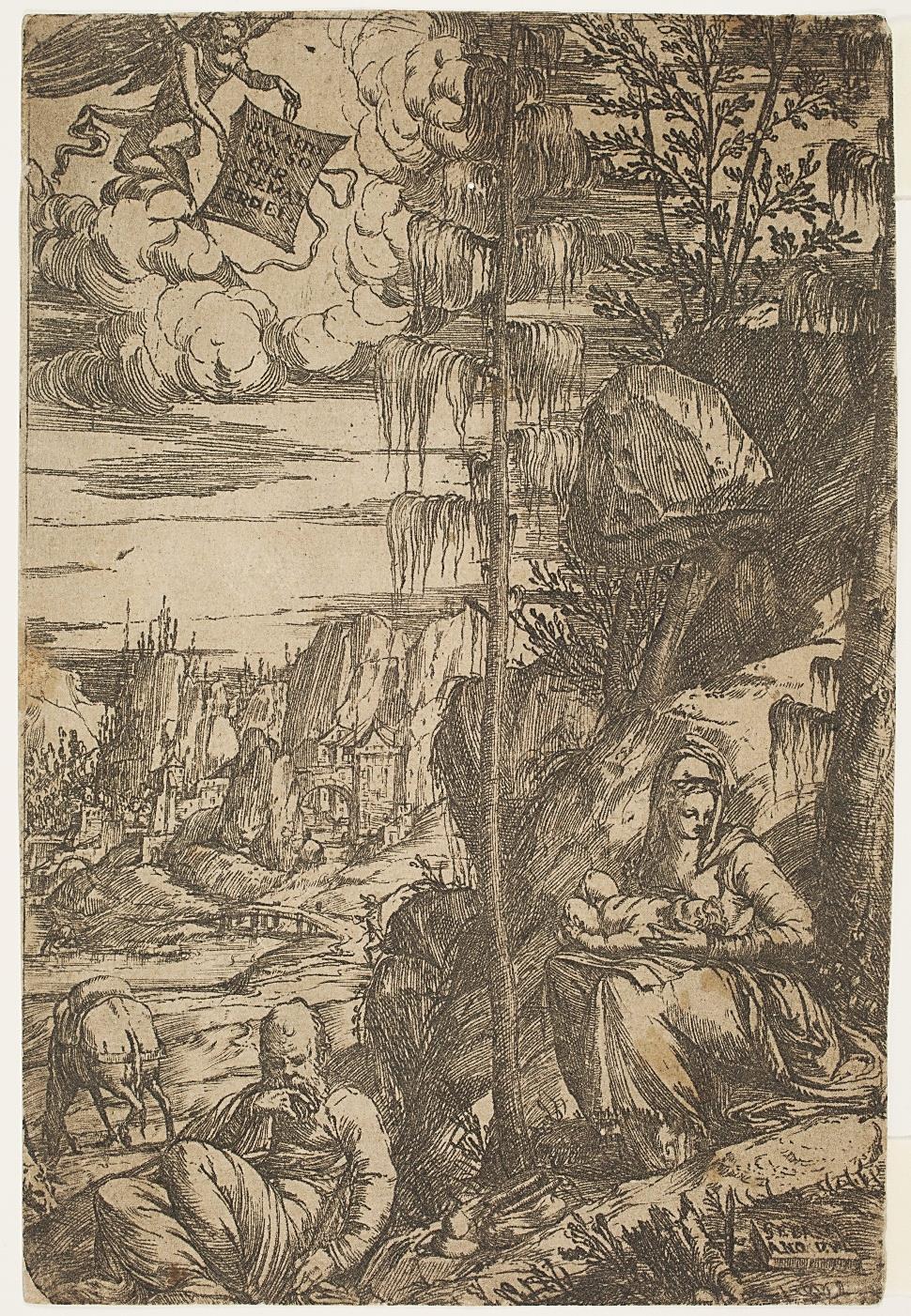 If the Virgin, Joseph and the baby Jesus, as well as their mount drinking from a stream, are represented in the foreground, their figures do not occupy the center of the image as is the case with Prometheus: the central figure of Landscape with the Rest on the Flight into Egypt is a very large shrub whose tapered trunk and tiered foliage guide the viewer's gaze towards the sky, where there is an angel presenting a tablet bearing this message: PIU ALTO NON SO DIR CHE MATER DEI [“I know of none higher than the Mother of God.]