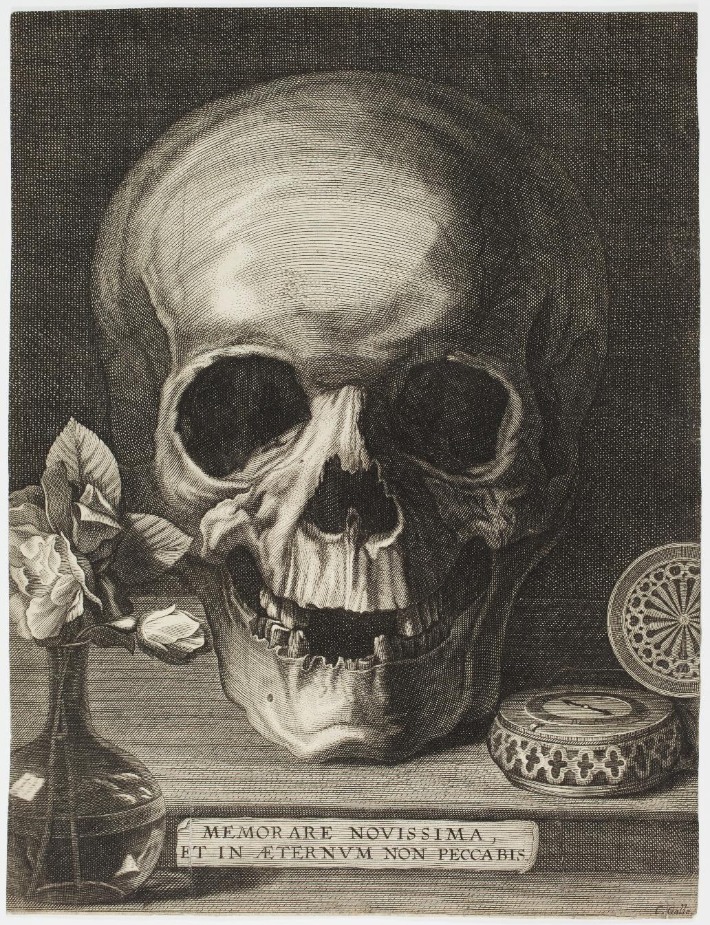 Engraving, 132 x 200 mm (sheet). Hollstein undescribed. This print does not seem to correspond to Hollstein 147 ("Allegory on Death, after Nic. van der Horst"), which refers to the description in Le Blanc 39: “Le Temps tirant un rideau et montrant un miroir dans lequel on voit la Mort : Nic. van der Horst. P. en Haut.” [Time drawing a curtain and showing a mirror in which one sees Death: Nic. van der Horst. Vertically]