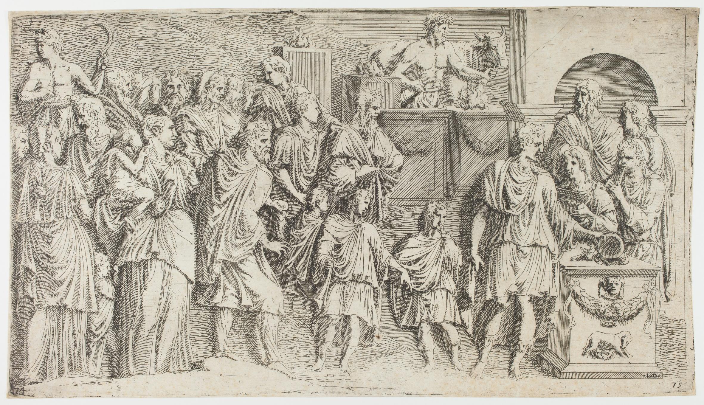 “This print, after a drawing by Primaticcio executed in Rome (inv. 584 Städel Museum, Frankfurt; Malke, 1980, no. 84), relates closely to a section of Trajan’s Column (LXVI/XCI) that depicts the Emperor Trajan at an altar in the presence of Romans and Dacians, women and children (illustrated in Coarelli, 2000, pp. 150-151, plates 106 and 107).” Catherine Jenkins: Prints at the Court of Fontainebleau, c. 1542-47, 2017, p. 58)