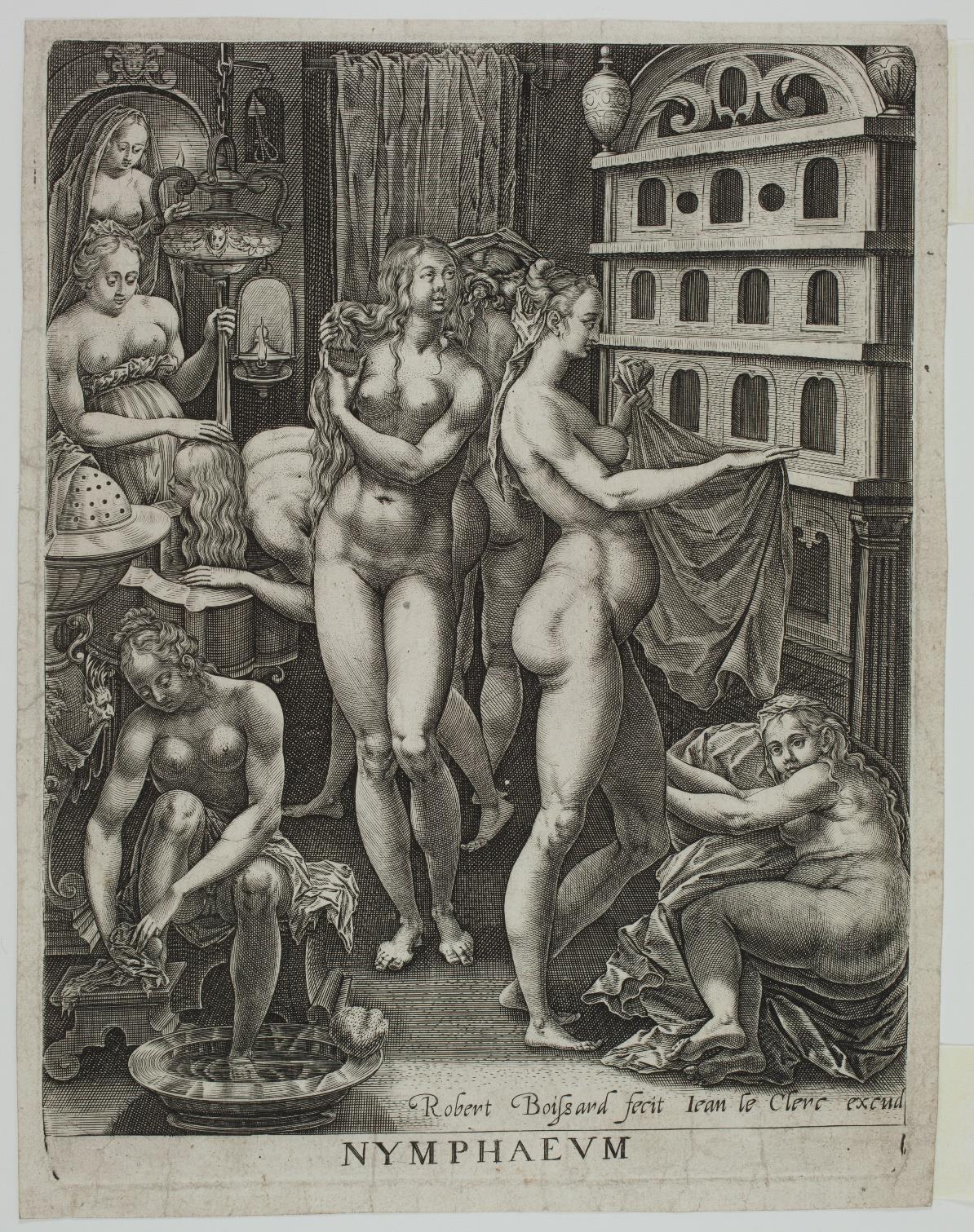 Nymphaeum depicts a group of seven women in a public bath. The theme of women in the bath is a recurrent one in old prints: either the artist uses a mythological illustration as a pretext, as in Venus Bathing Attended by her Nymphs, engraved by Jean Mignon after Luca Penni (Jenkins 34), or he treats the subject realistically, as in Three women in the bath-house by Bartel Beham (New Hollstein 49). These prints often contain erotic details. Here, a pair of scissors in a niche explicitly evokes a male sex.