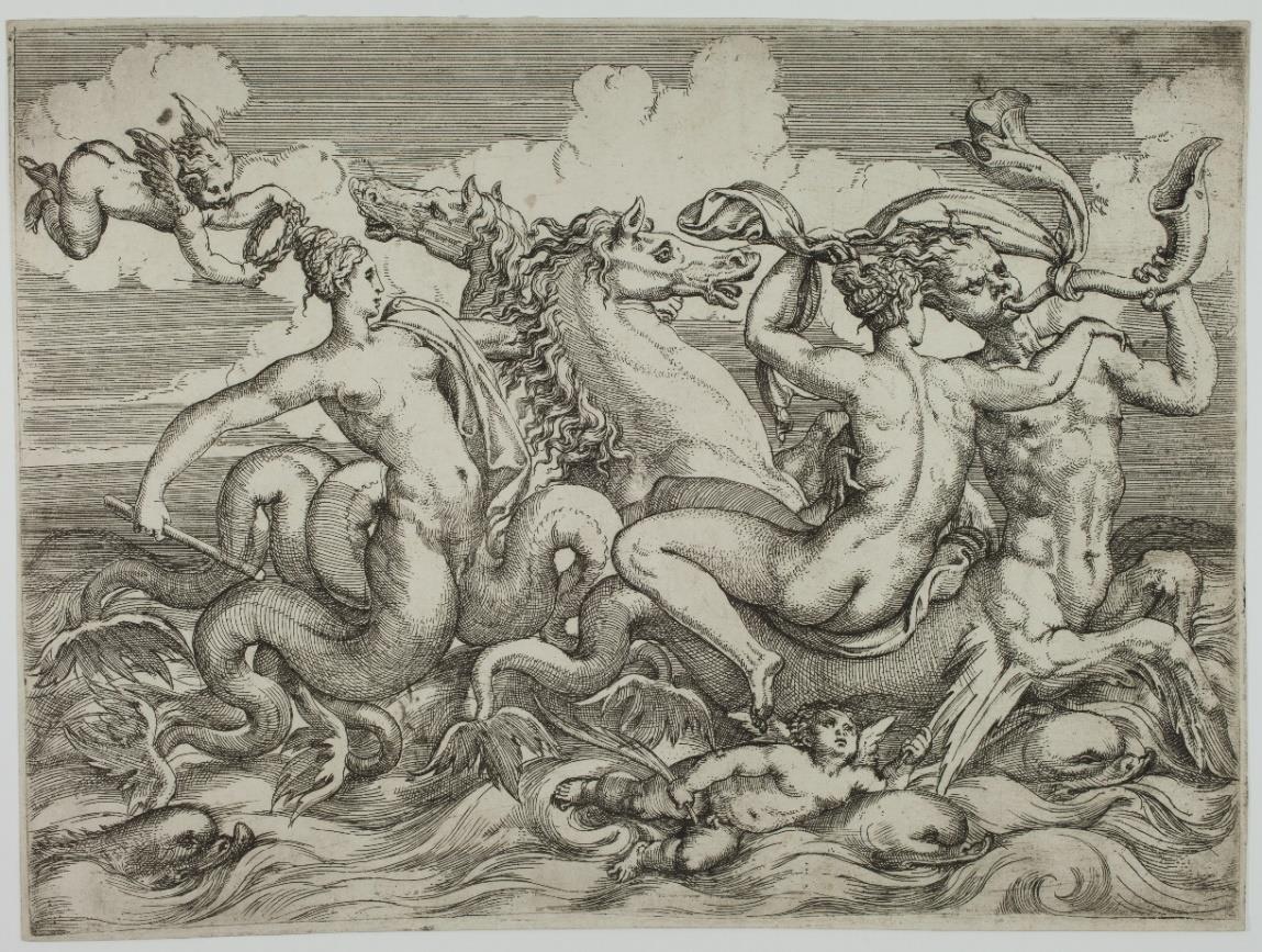 Catherine Jenkins recalls that this type of marine procession “had its roots in the classical marine thiasoi carved on ancient Roman sarcophagi”. She specifically notes that “the present motif of the Nereid viewed from behind riding on the back of a sea centaur […] appears on a marine sarcophagus that was in the collection of Cardinal Andrea della Valle during the sixteenth century, which inspired many Renaissance artists.” (Nadine Orenstein et al.: The Renaissance of etching, 2019, cat no.82, pp. 178-179).