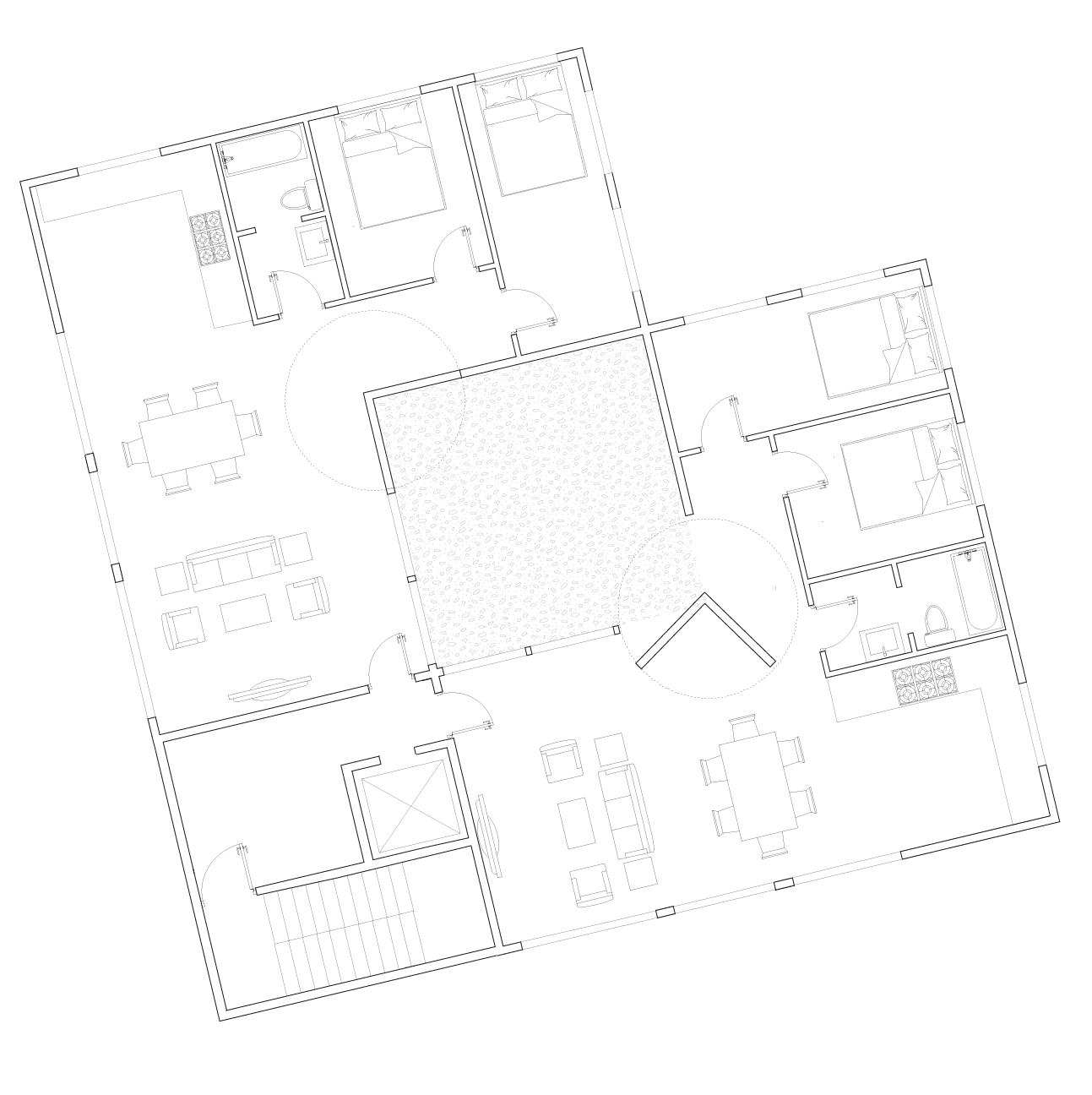 Flexibility was not limited to the courtyard but extended to the unit, room, and building scales. Early iterations tested different configurations of rooms within the units and their relationship to the central courtyard. This iterative process ensured that the module could adapt to varying site conditions and programmatic requirements. By prioritizing modularity and scalability, I developed a system that could be deployed in diverse contexts while maintaining design integrity and functionality.