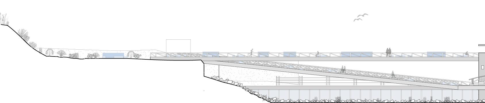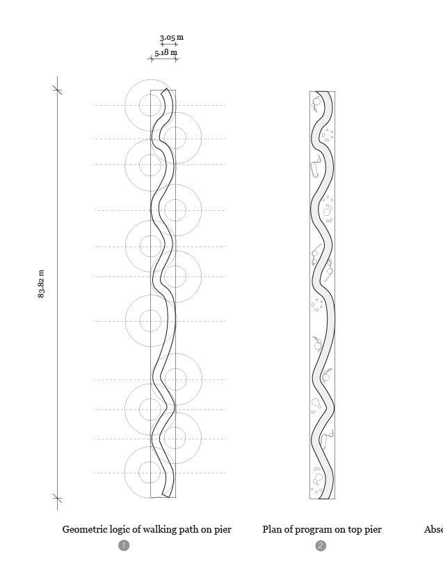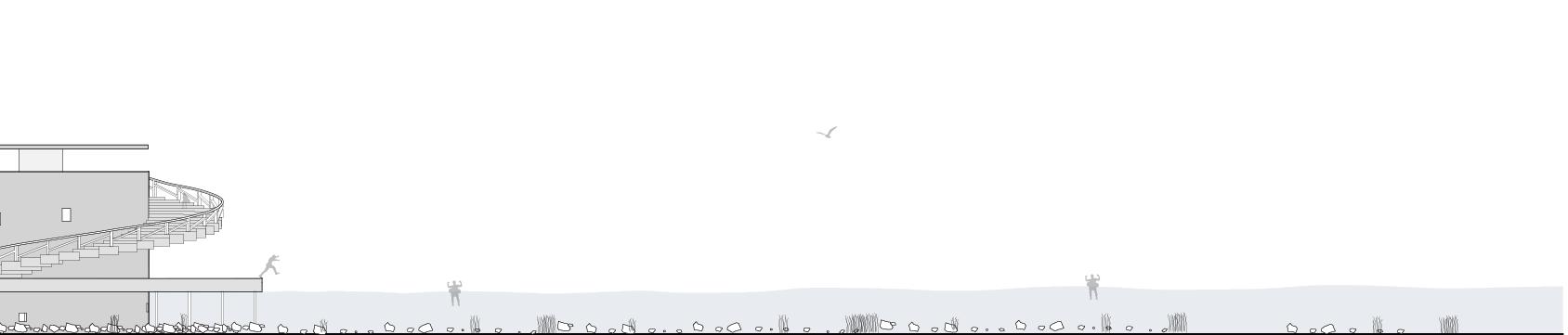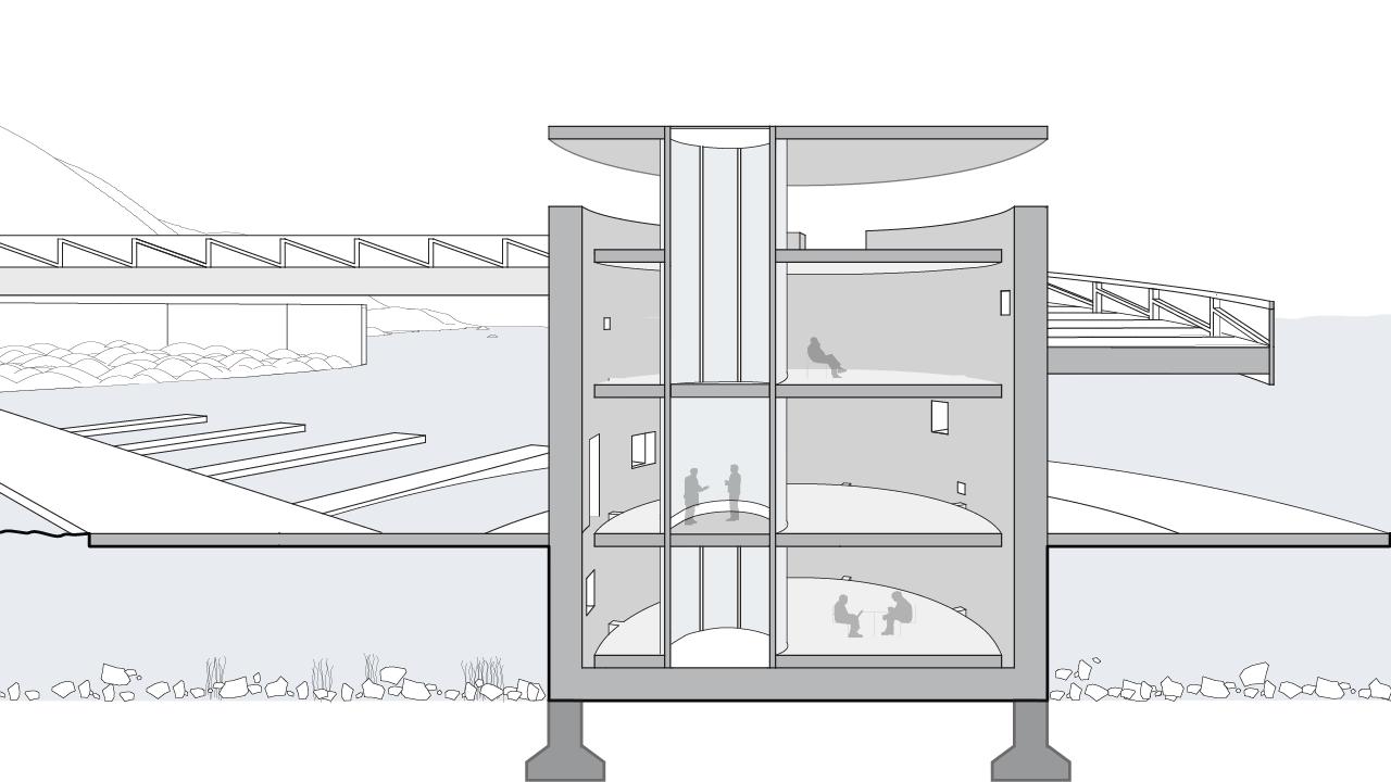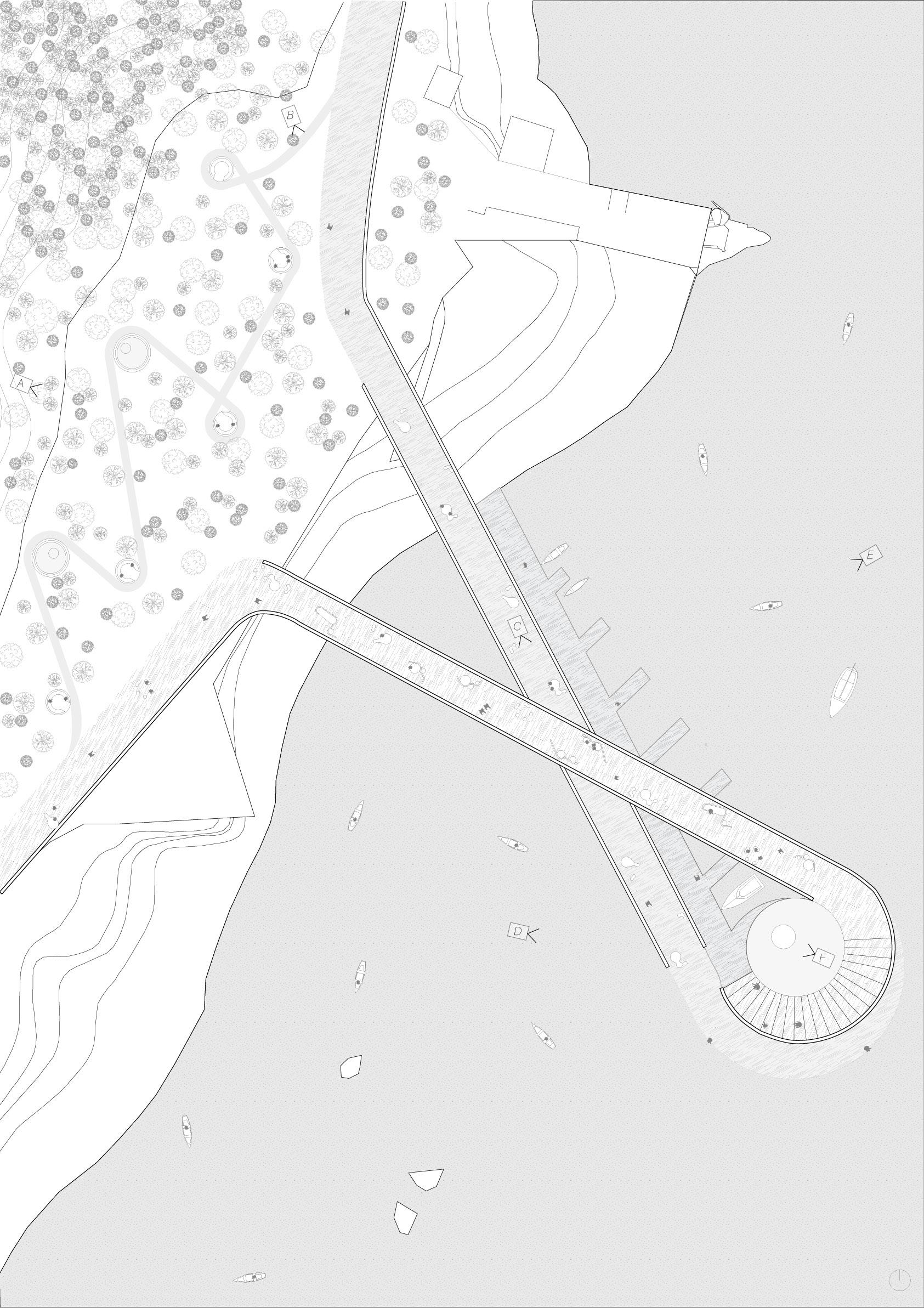 A looping pathway forms the backbone of the design, linking to existing walkways and organizing various programs. At its center is a circular volume, functioning as a hub for students to study and gather. Surrounding this are distinct pathways: the lower levels serve transportation and boat docking, while the upper layers are designed for after-school activities, gathering spaces, and seating.