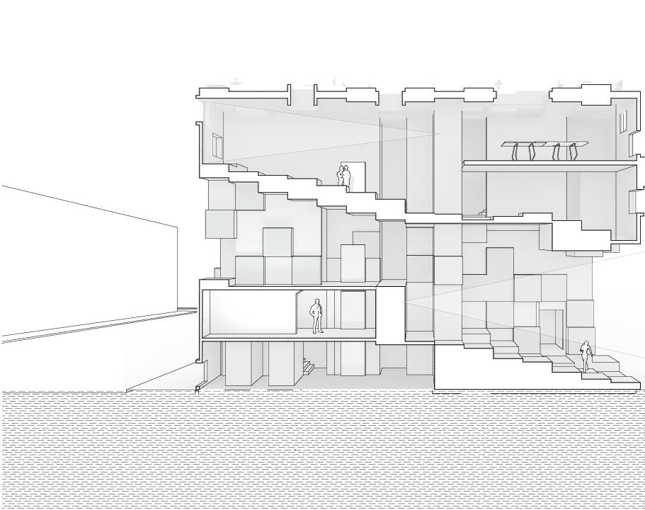 Pixelated bridges the world of the artist and the consumer through digital art, creating a dynamic interplay between private creation and public consumption. The design is anchored by a bottom-heavy structure that houses administrative functions, ensuring the smooth operation of the space. Above this, the upper volume is dedicated to artist studios, providing secluded areas for the creative process. These two dense volumes are connected by a transitional space, where people are invited to experience and engage with the artist’s work in a vibrant public environment.