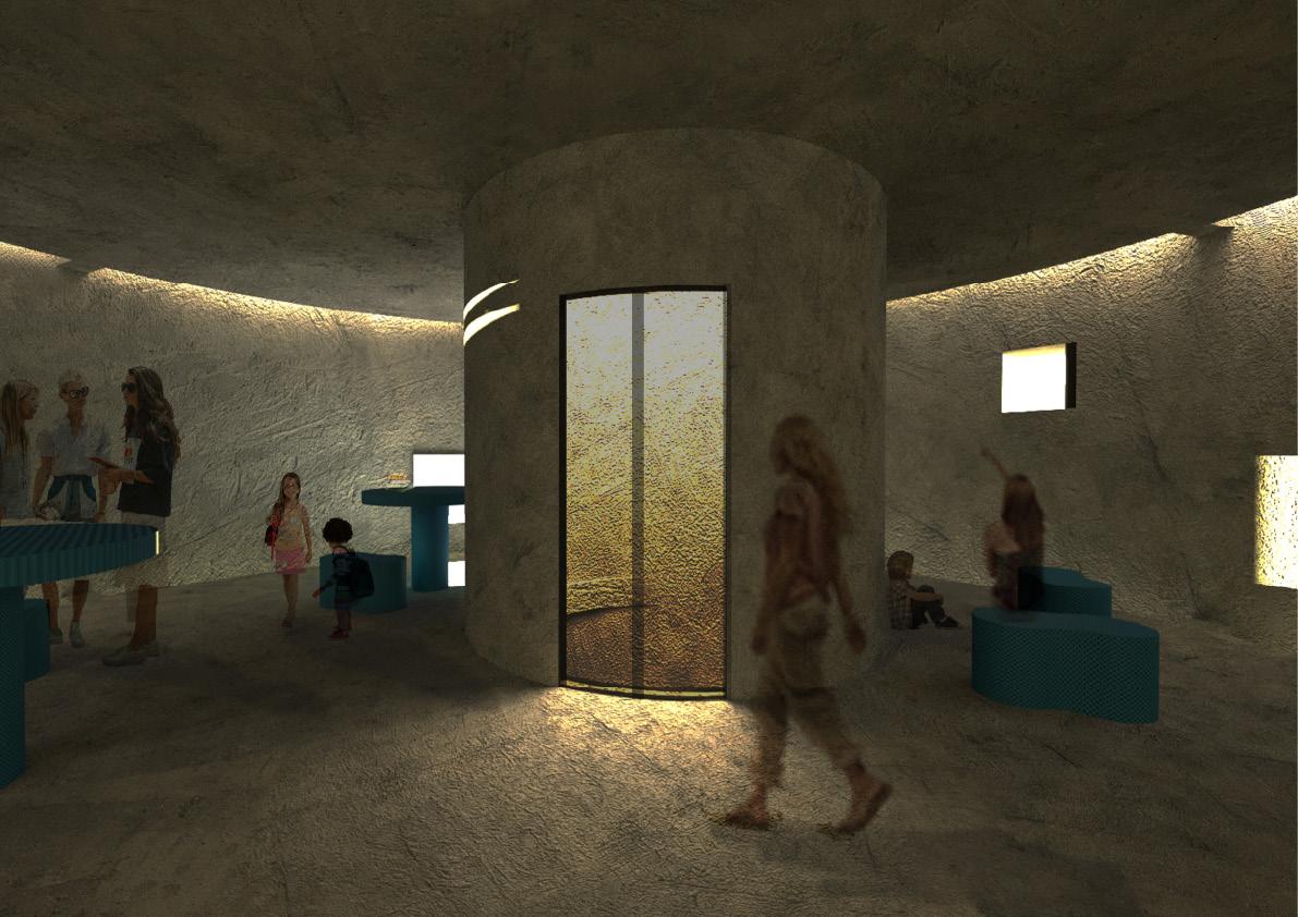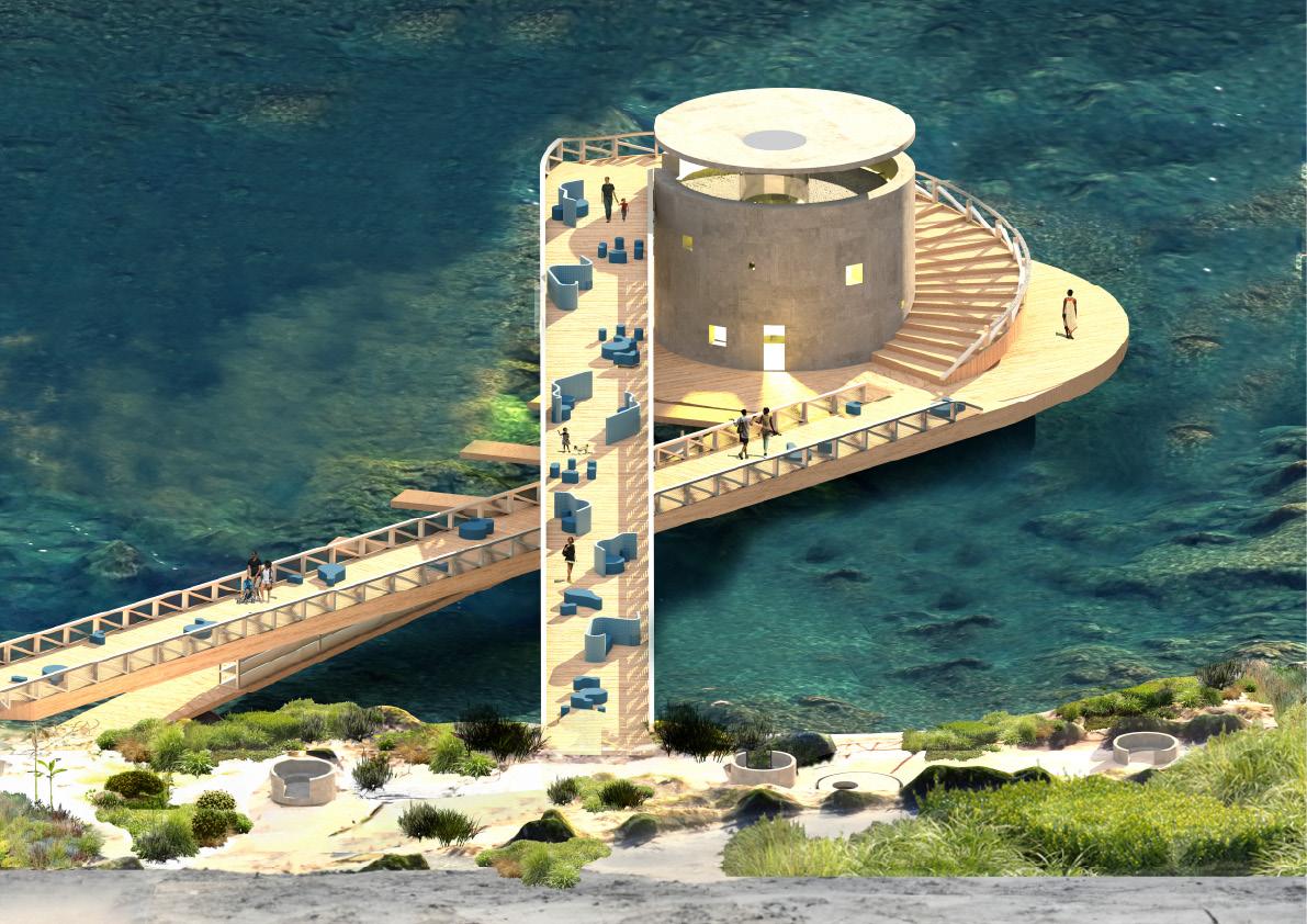 Furniture and pathways follow a geometric logic, with circular seating divided by tangent lines to create flexibility for different-sized gatherings or individual use. The design also contrasts open, bright outdoor spaces with the enclosed, immersive interior of the circular hub, which extends below the waterline to provide underwater views of the existing pier’s remnants. By addressing programmatic needs and enhancing connectivity, the project creates a dynamic space that benefits both Rio Marina and the island as a whole.