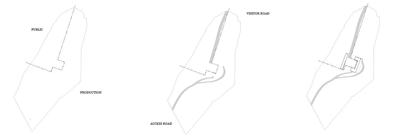 The site’s dual access points offered an additional layer of complexity and opportunity for the design. These two distinct entrances informed the development of a public-versus-operative site strategy, ensuring that visitors and production processes remain separate yet interconnected. This division allowed for the creation of dedicated spaces for public engagement, such as tours or tastings, while preserving the efficiency and functionality of the operational areas.