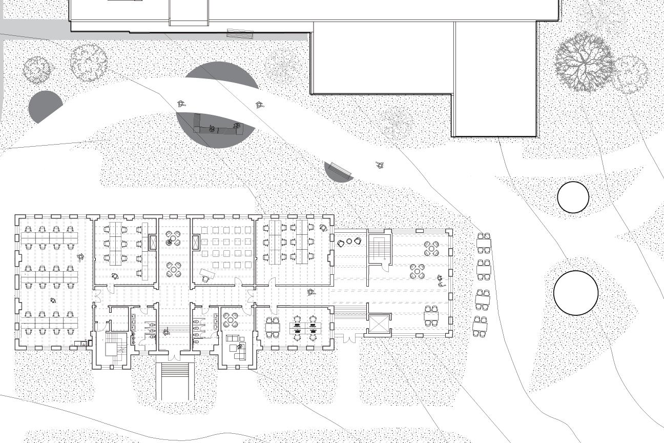 Underground, the addition introduces maker spaces tailored for cross-disciplinary collaboration. These spaces are integrated into the site through a new landscape, which allows students to traverse the campus while engaging with the creative activity below. Skylights embedded in the terrain bring natural light into the underground levels and provide views into the maker spaces, blending interior and exterior elements to highlight the creative process. Above ground, new studio and pin-up spaces expand the building’s capacity, fostering opportunities for interaction and collaboration.