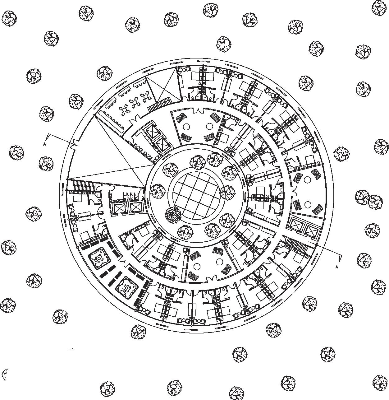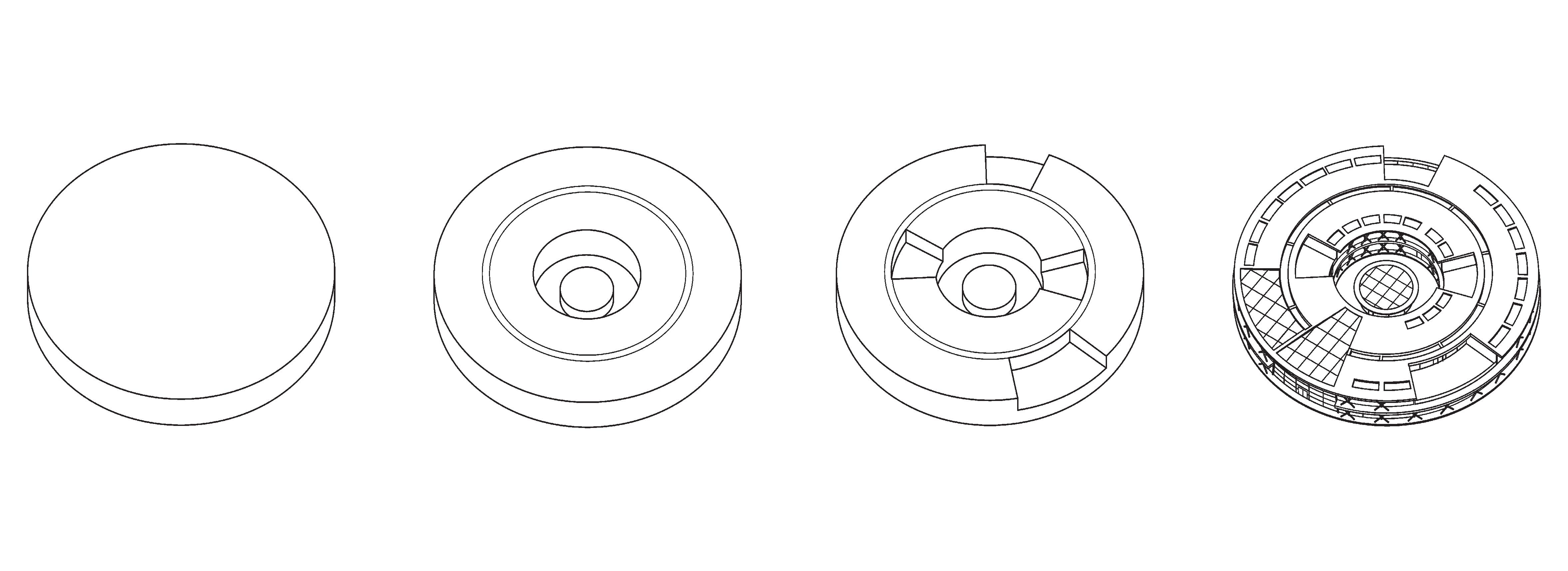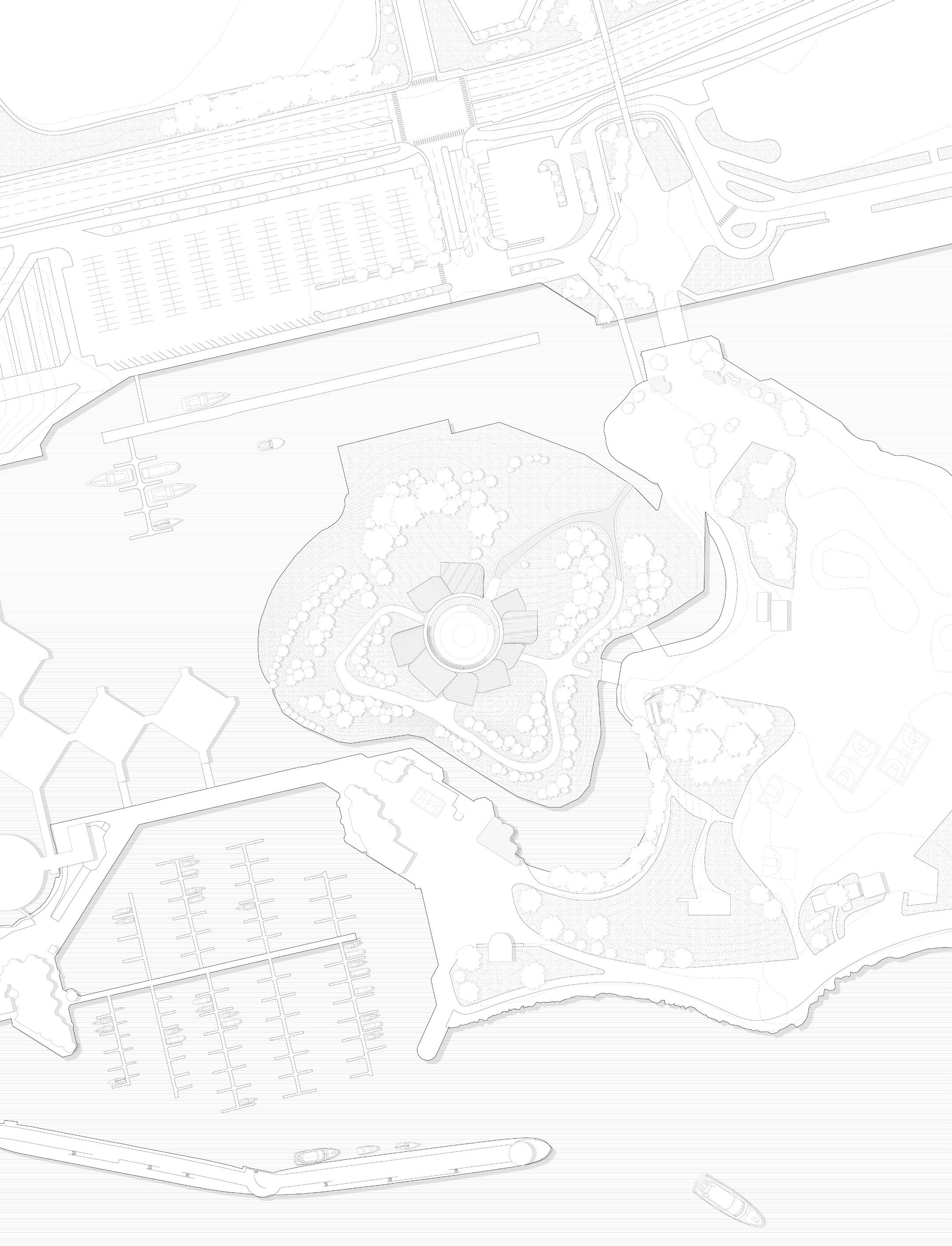 The proposed architectural design for the new civic and bathing facility, situated at the heart of the former Ontario Place Forum. The building's circular design situates an expansive, unobstructed view of the surrounding environment, enhancing visitors’ sense of connection to the natural landscape. This form maximizes peripheral vision, reinforcing an immersive experience that blurs the boundaries between built space and nature. A continuous ramp encircling the structure further enhances this sense of fluidity and unity, guiding movement through the space in a dynamic yet harmonious manner.