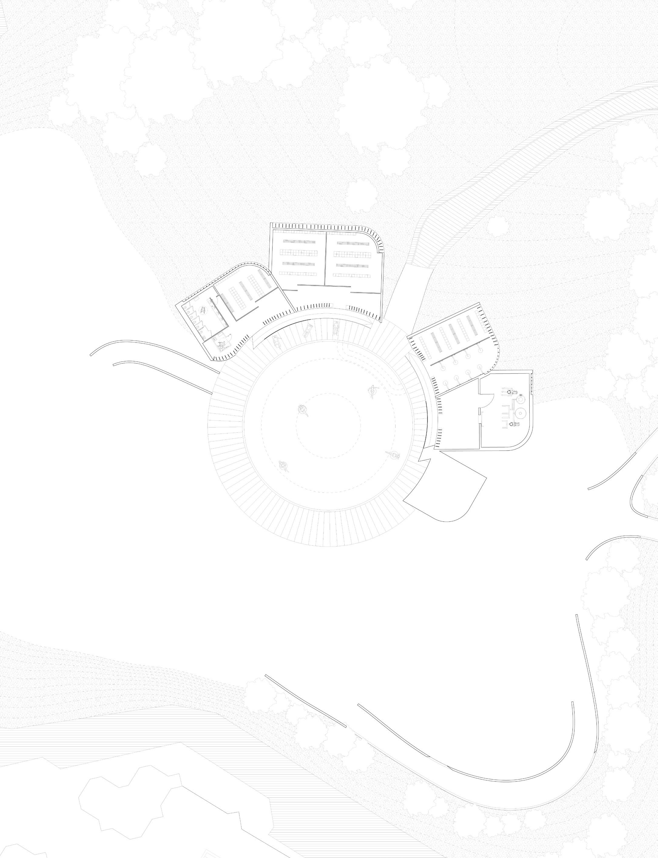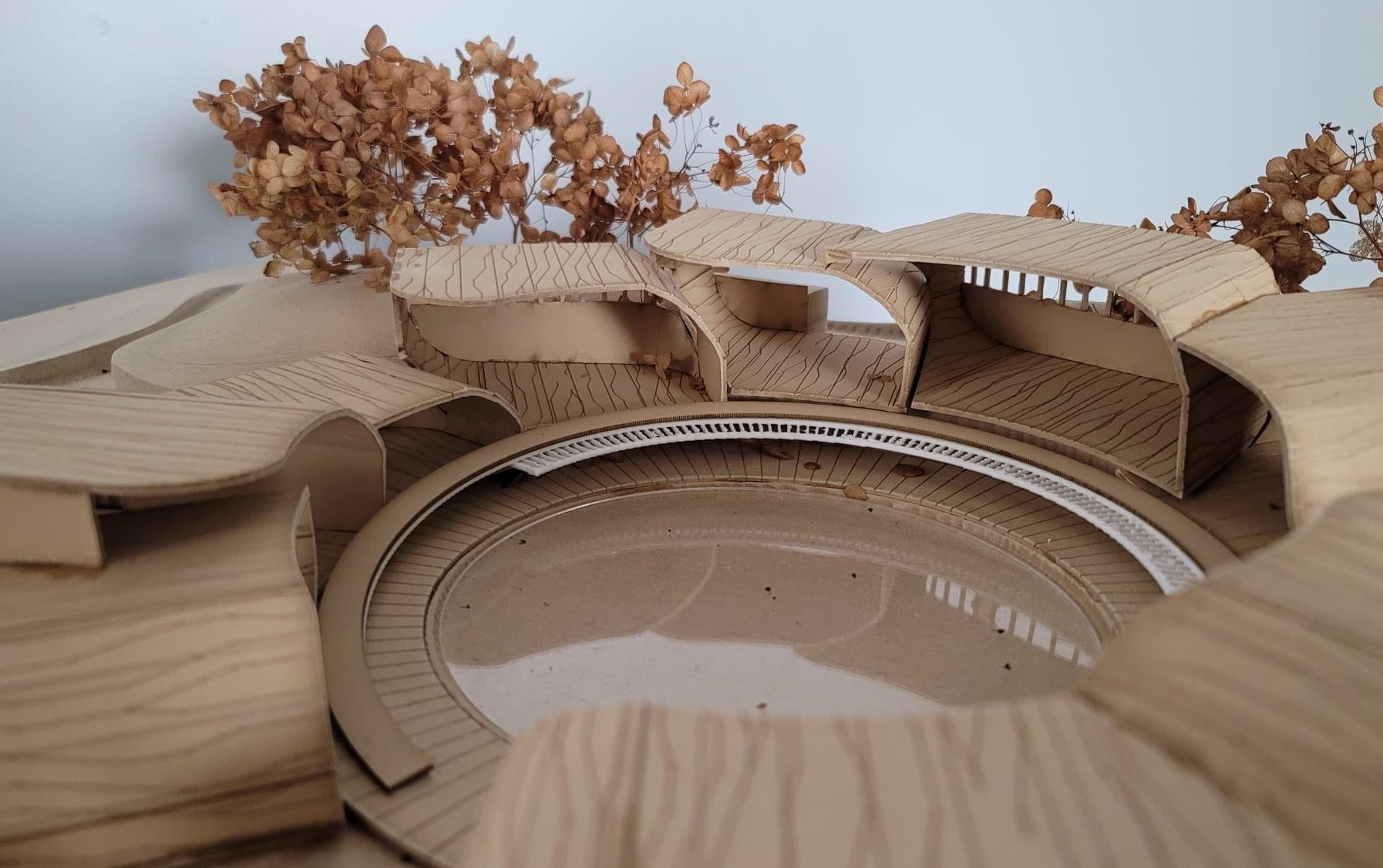At the core of the design is a courtyard-like swimming pool, which serves as a central void that facilitates natural light and ventilation throughout the facility. Strategically positioned, the pool functions not only as a recreational space but also as a symbolic and experiential anchor, evoking the essence of communal bathing traditions. Its presence enhances the building’s monumental character and layered spatial composition, inviting both locals and visitors to engage with water as a vital element of the public realm.