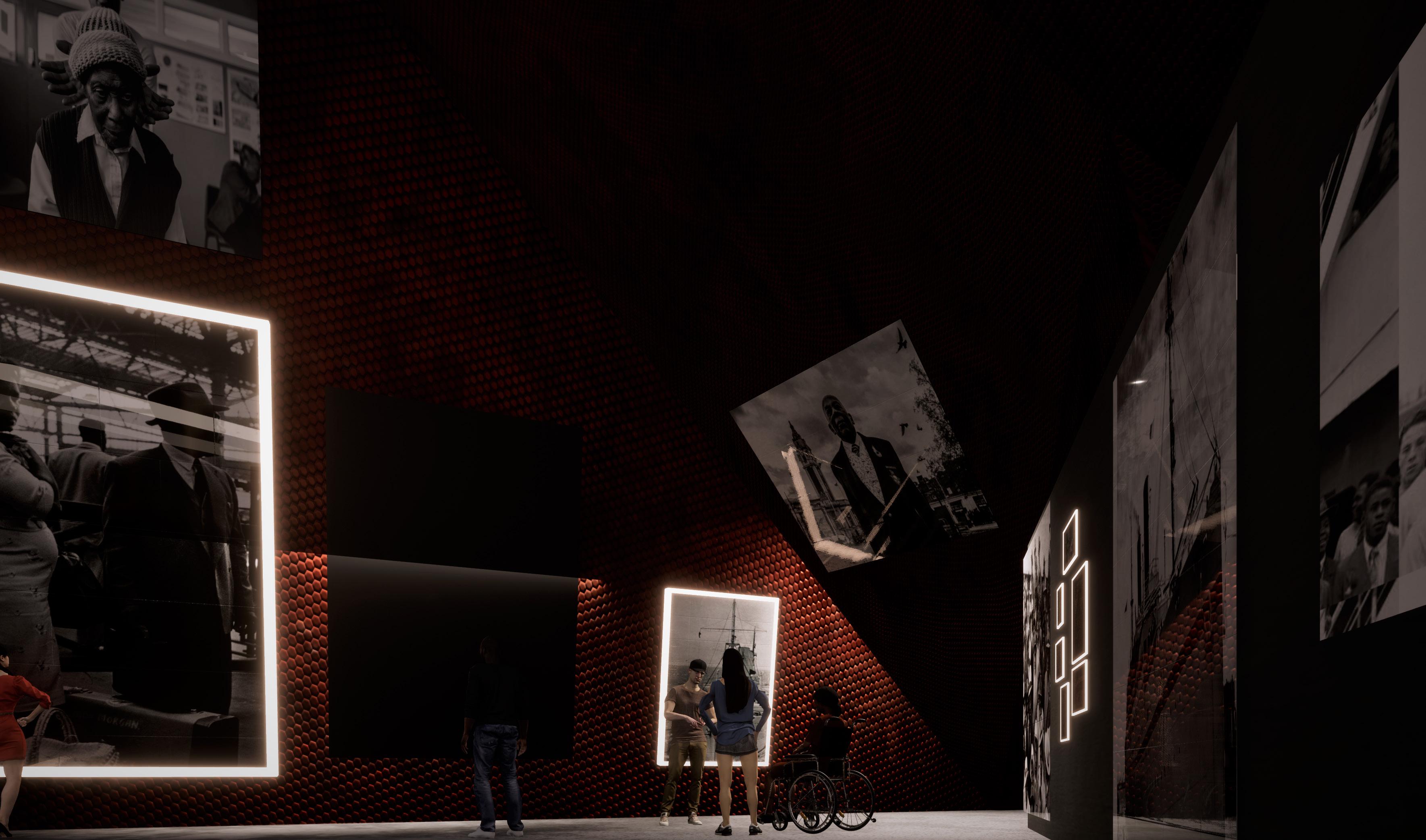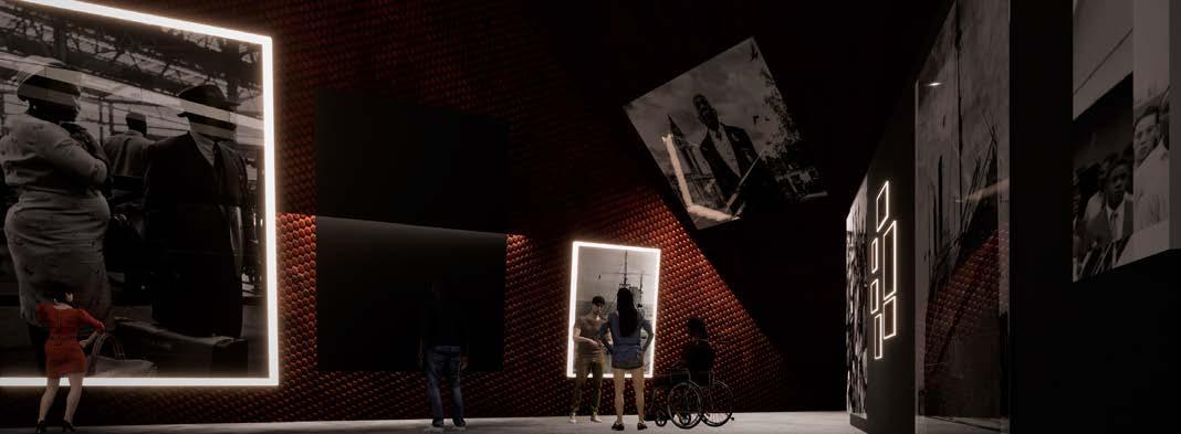tardis effect, the people were opened up to a massive world of opportunities, but still to an extent felt caged The columns: a space for people to flect, find shelter and to represent the caged feeling many felt as if they were inprisoned Reflection: a space in a small corner, reflecting the way society sees the windrush generation, as if it should be hidden ATMOSPHERE