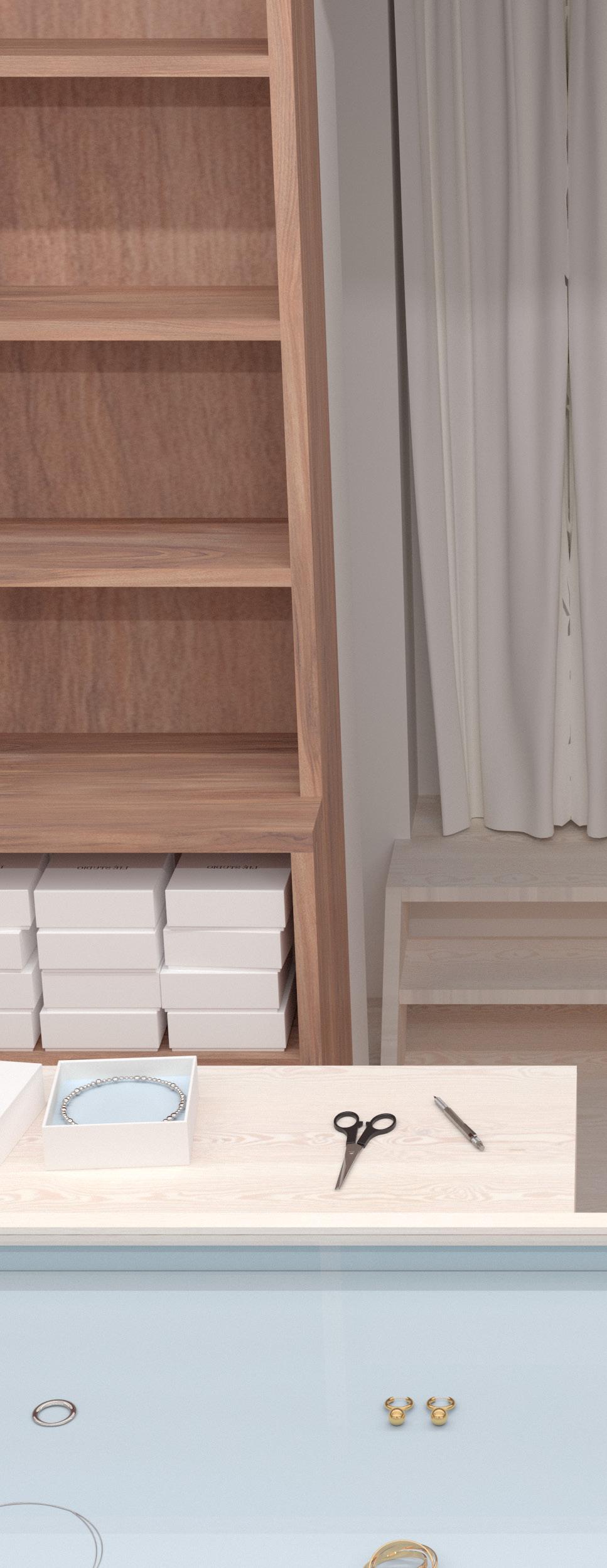 In this project, my aim was to explore the intersection between retail design, museum and exhibition design. For the jewelry brand Lié Studio, I created a small store at Gammel Kongevej 133 with the overarching theme of ’the poetic value of jewelry’ . My objective was to investigate how to exhibit the products in a manner that conveys the notion of the jewelry having emotional and sentimental value to its owners by displaying it in connection with other sentimental valuables.