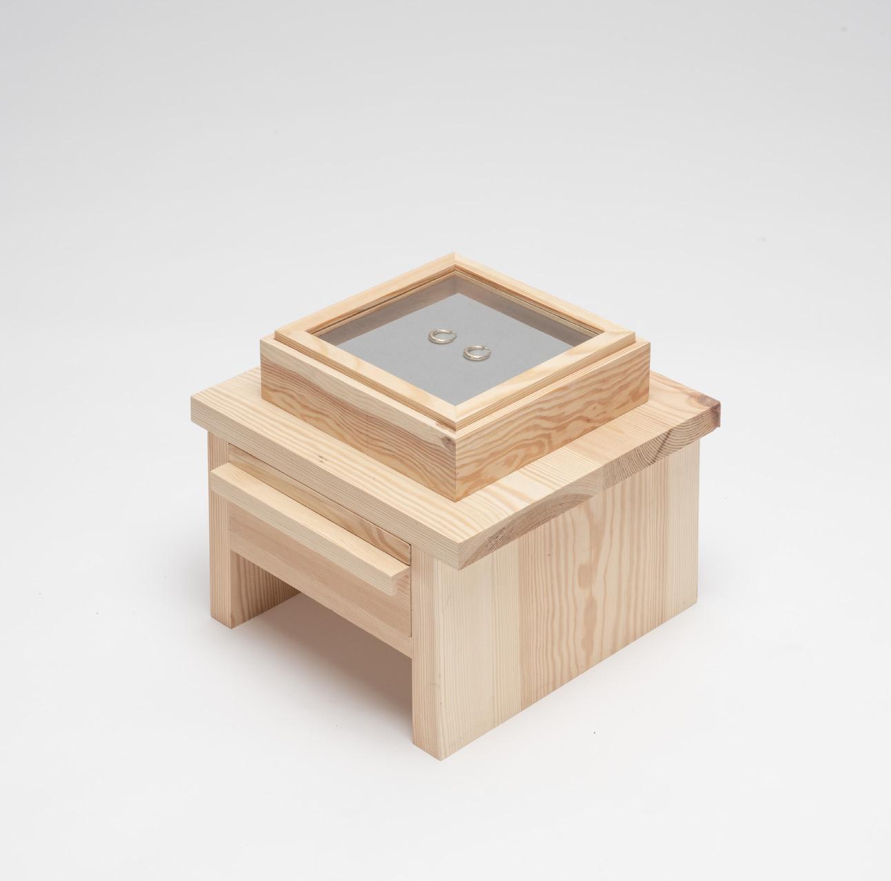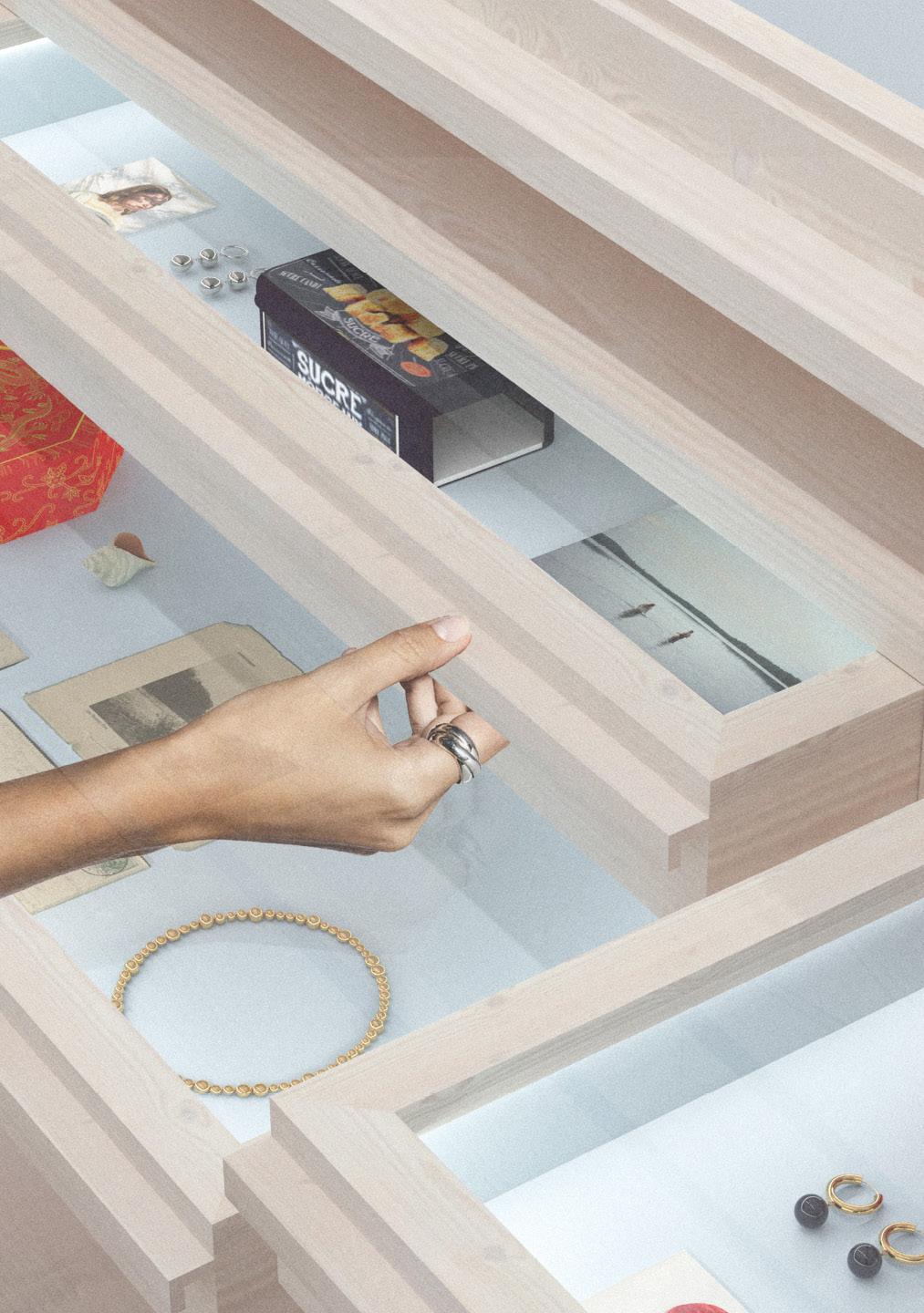 Each drawer in the exhibition furniture contains a piece of jewelry and a collection of other personal objects. On top of the furniture, the complete jewelry collection is on display.