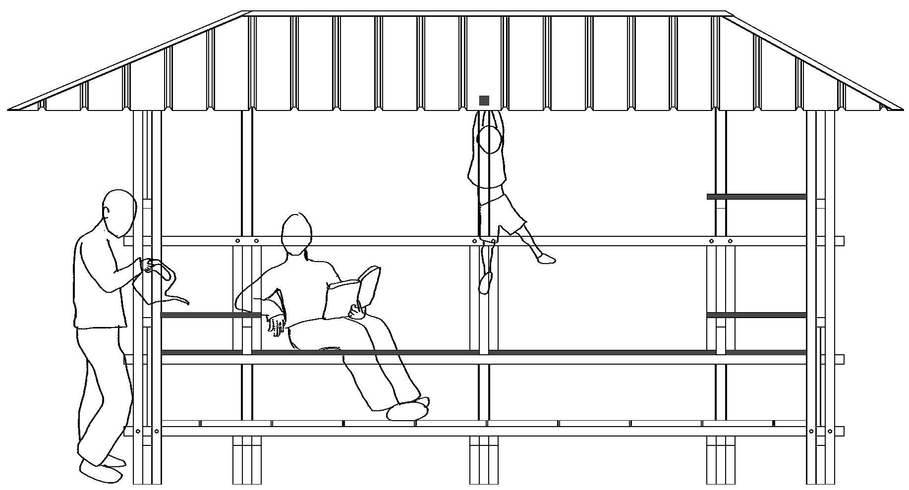 We used a personality-based design approach, taking into account the unique needs of the three residents: the pensive individual requiring space for reading and relaxing, the playful in need of an area to move around and play, and the practical necessitating space for garden work and bike maintenance. Through the construction of a small pavilion, our aim was to create a versatile space that could cater to the diverse needs of the residents while still allowing for a space for being together.