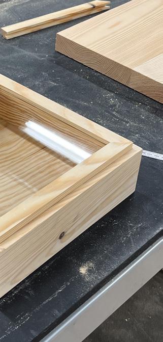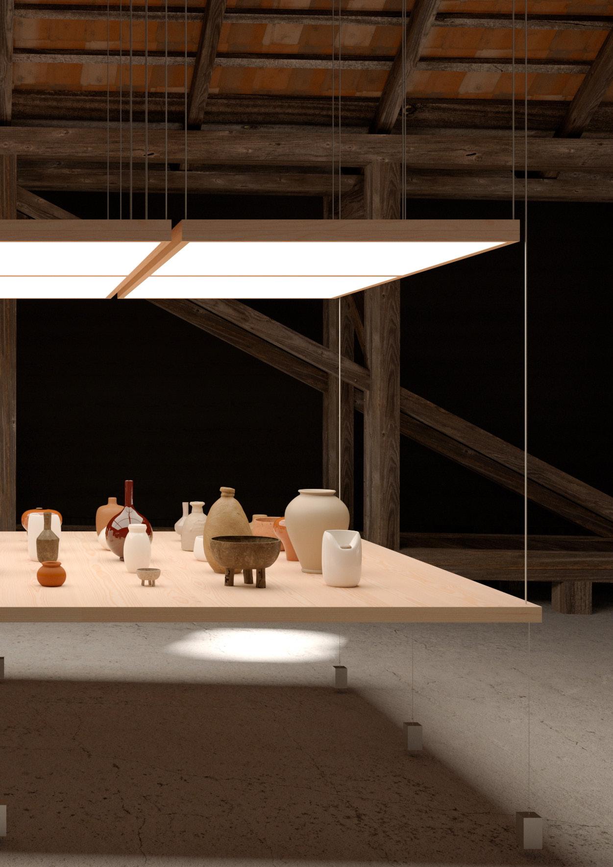 I developed a concept of hanging light boxes and surfaces to exhibit different objects on. The exhibition design needed to be flexible, to showcase the students ever changing designs. Further, I decided to include the lighting source within the design, given that the boatshed is naturally very dimly lit. The light boxes are made from douglas wood and glass, and are lit up with led. The weights are made of aluminium.