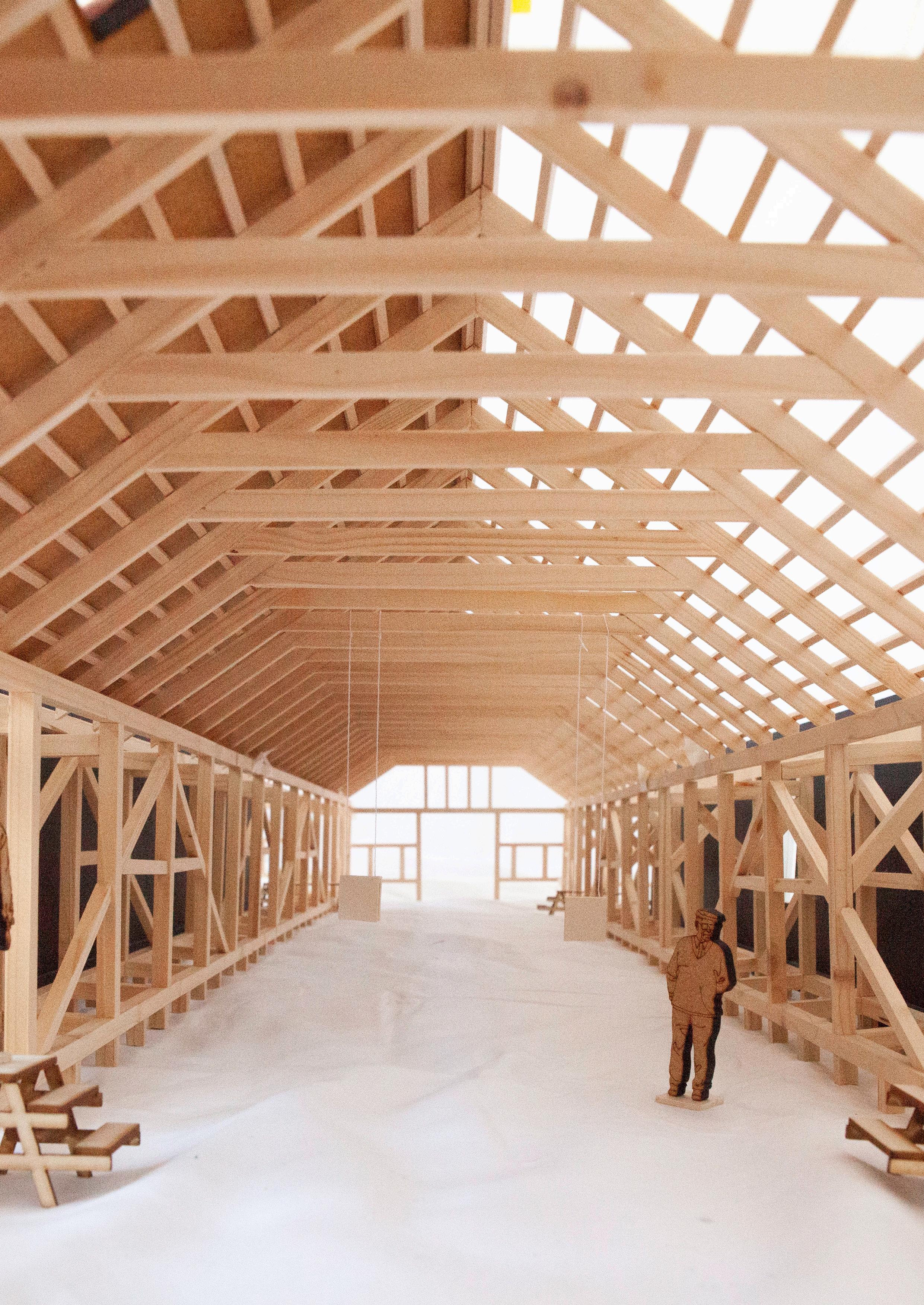 Today, the gunboat shed serves as storage facility for boats. During the site visit, I developed a deep appreciation for four particular elements. These elements subsequently played a central role in shaping my design: 1. The remarkably long rooms with a gradual slope towards the water. 2. The shed’s impressive beam structures. 3. The natural light streaming through small openings in the roof creating spotlight-like lightling. 4. The exposed roof tiles.