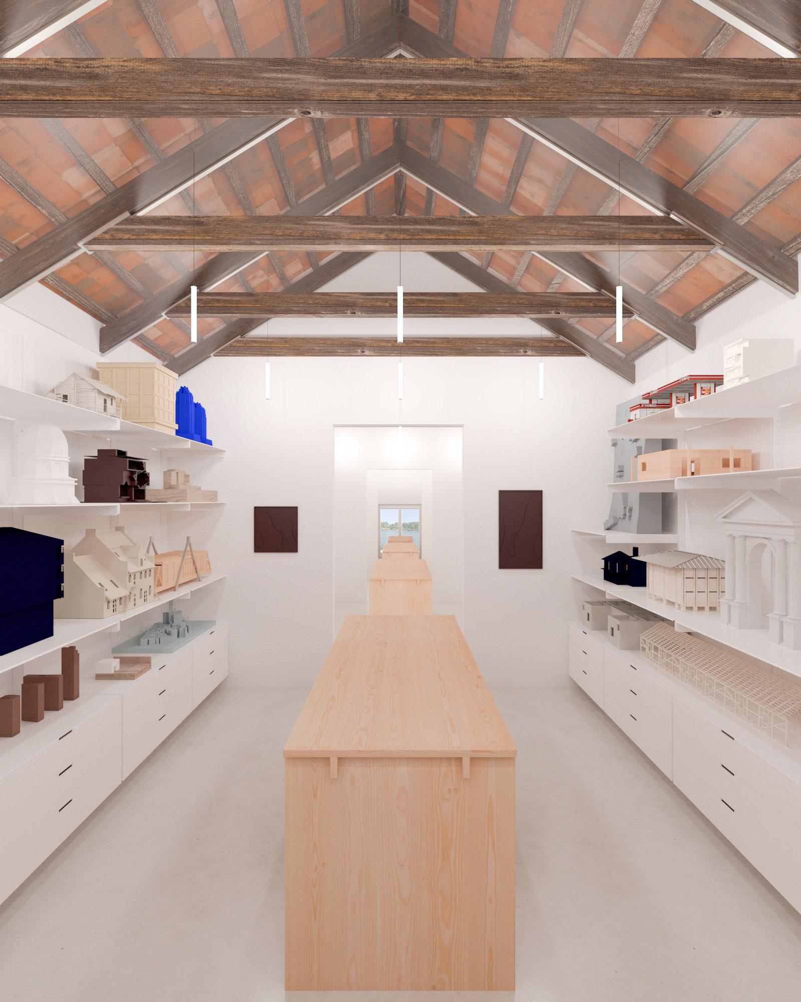 One of the most important things for me was to honor the original building - to not only create an exhibition design for the students’ projects, but also to exhibit the original boat shed. The render above shows a corner of the auditorium where the large windows showcase the interior wall of the original facade of the gunboat shed.