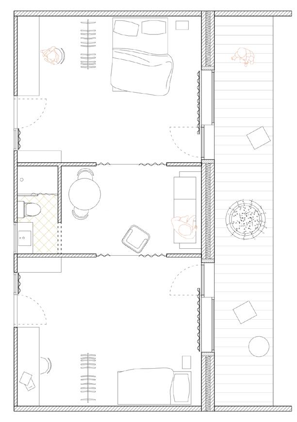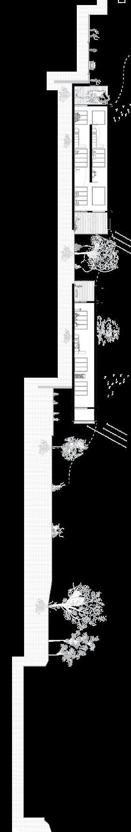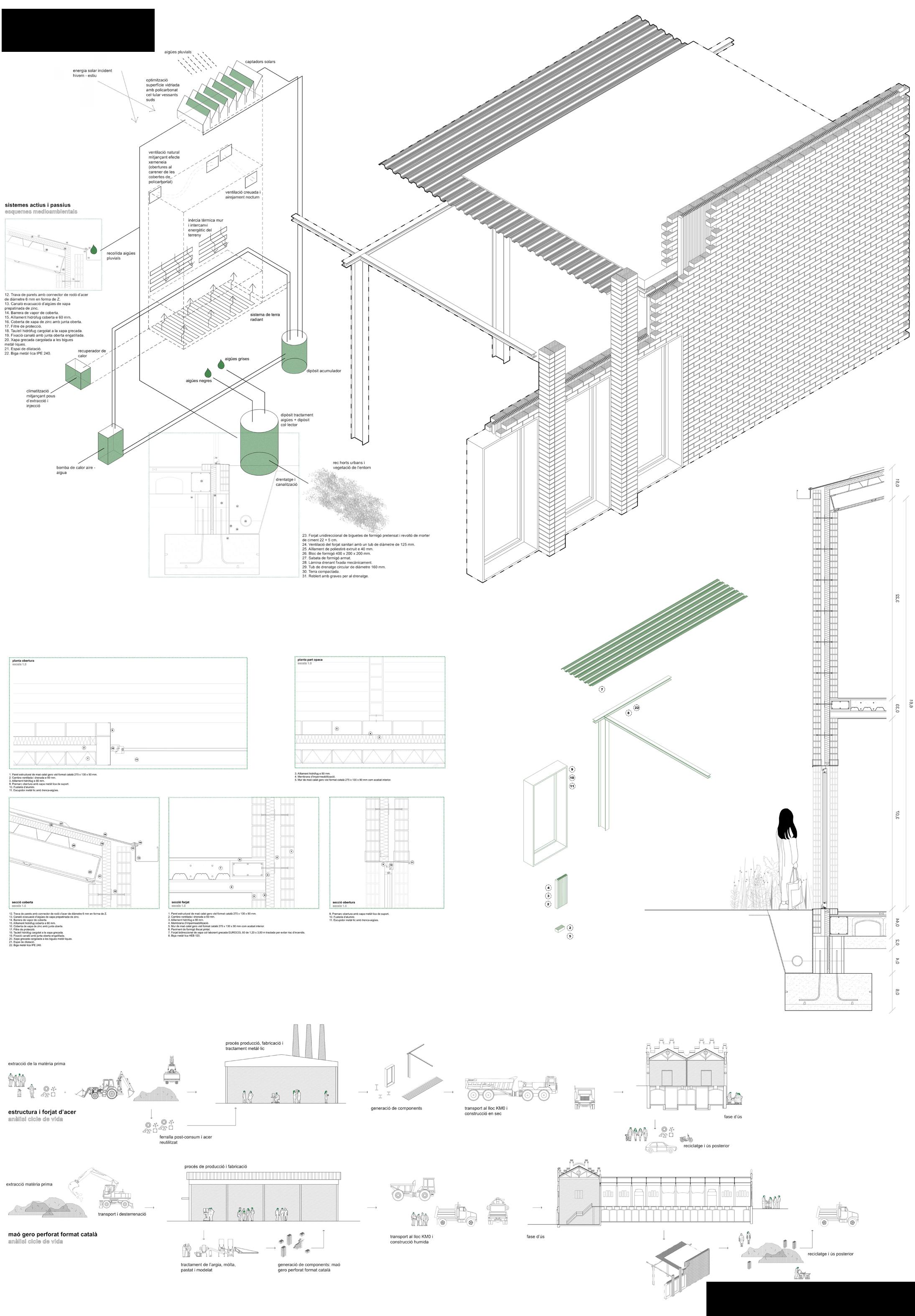 Rehabilitation project in the late fifties cardboard factory. We had to assess different patrimonial buildings to end up with a co-housing program for 300 inhabitants. The minimum demolition was requested as well as the maximum preservation of the characteristic elements, especially the brick of the facades, which allowed the ventilation and drying of the paper. To accomplish what the program required, we first recognized and understood the existing pillar structure. Our strategy was based on a main central corridor which adapted to the irregular shape of its floor plan by having a Z shape circulation. This corridor also had a continuous connection with the exterior by two main courtyards and horizontal terraces. Those were given by the two transversal voids that crossed the entire building. As a result, the connection between the terraces and our housing units provided our project with ventilation and natural light. Every four to eight housing units had a double-height shared space. Our main goal was to be able to visualize a gradient from the most shared area (40%) to the most private one (60%). The need of a non-existing connection between the neighborhood and our ground floor was evident. Our GF was a result of that, by also having a continuity of what our strategies were on the top floors. Our project aimed to emphasize the vital importance of the maintenance of industrial heritage and the possibilities presented by its use in this case for housing.