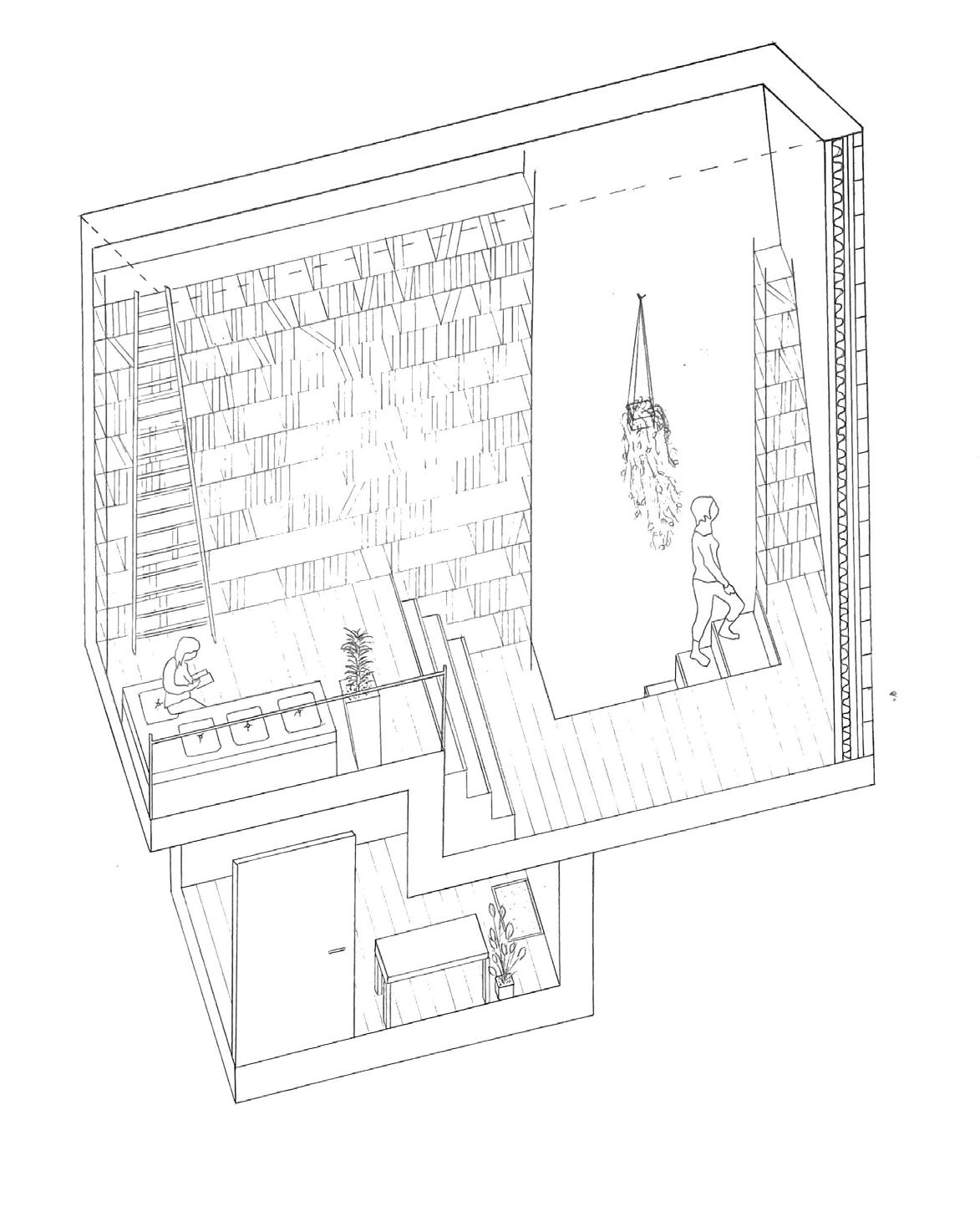 Inhabit the facade. Transformation of the Moca House, a small domestic building desinged by Atelier Bow Wow. In order to get the most light, I designed a library-living room with access from the top floor. The principal aim of its form and its construction was to fulfill four principal factors: use, ergonomics, materials and relationship with light.