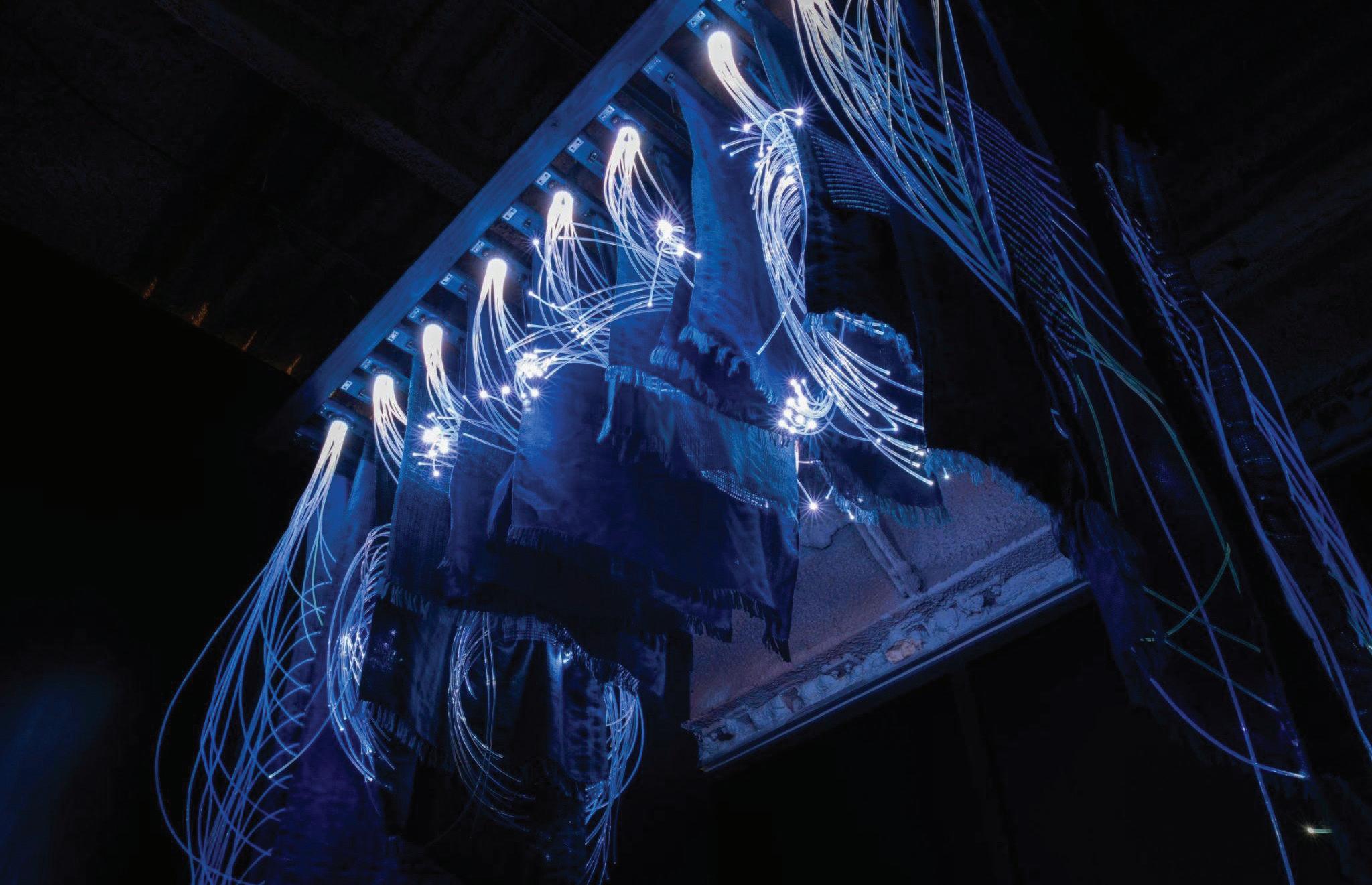 18 woven textile panels with fiber optics, LEDs, computer, microphone, open Frameworks software, and Arduino, 4ft X 8ft X 8ft, 2024.