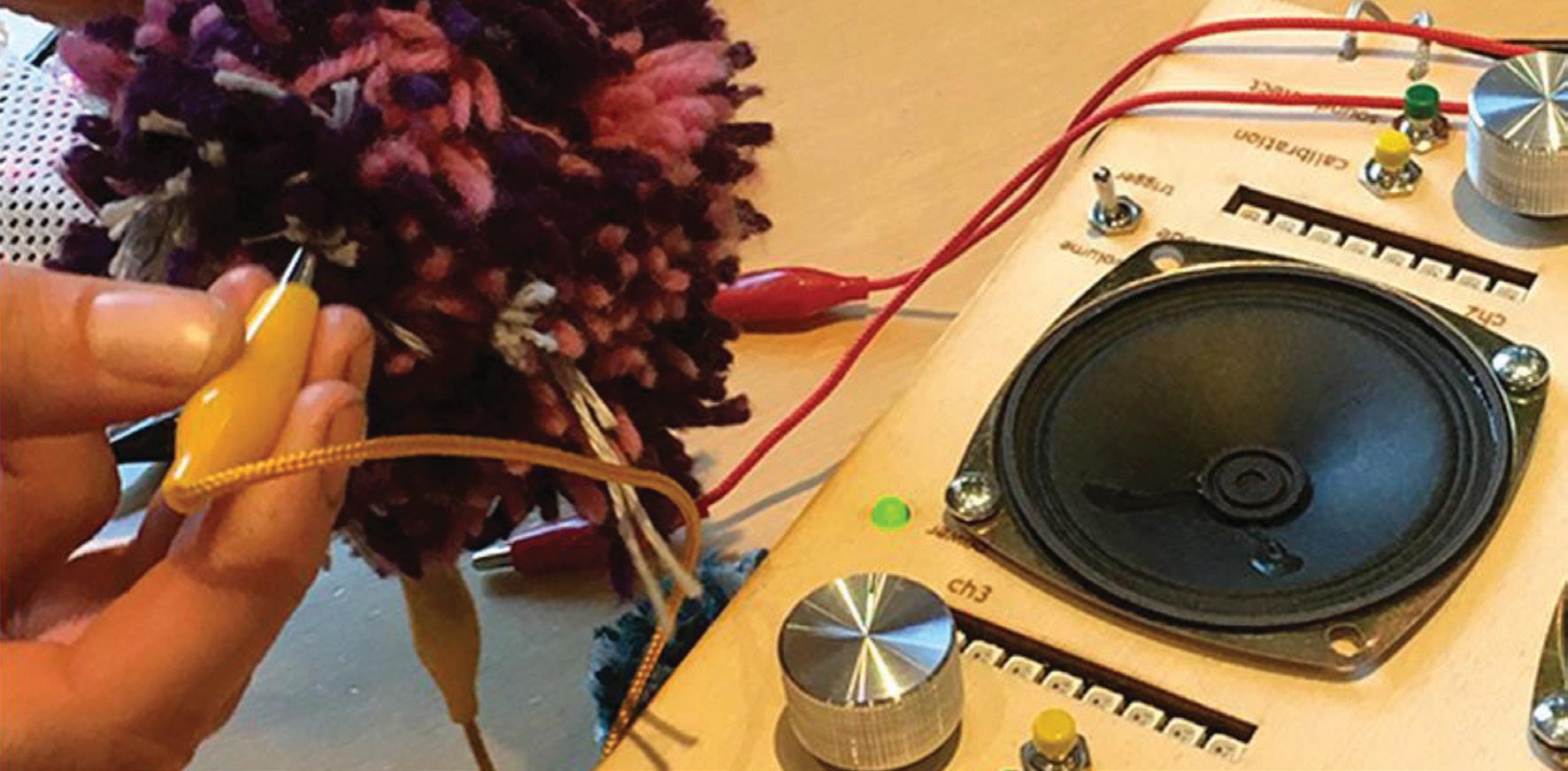 Textile sensors with conductive materials are attached to the sound sample player using crocodile clips. Testing the sound sample player at an e-stitches event in Bristol. Close up of sound sample player controls and displays.