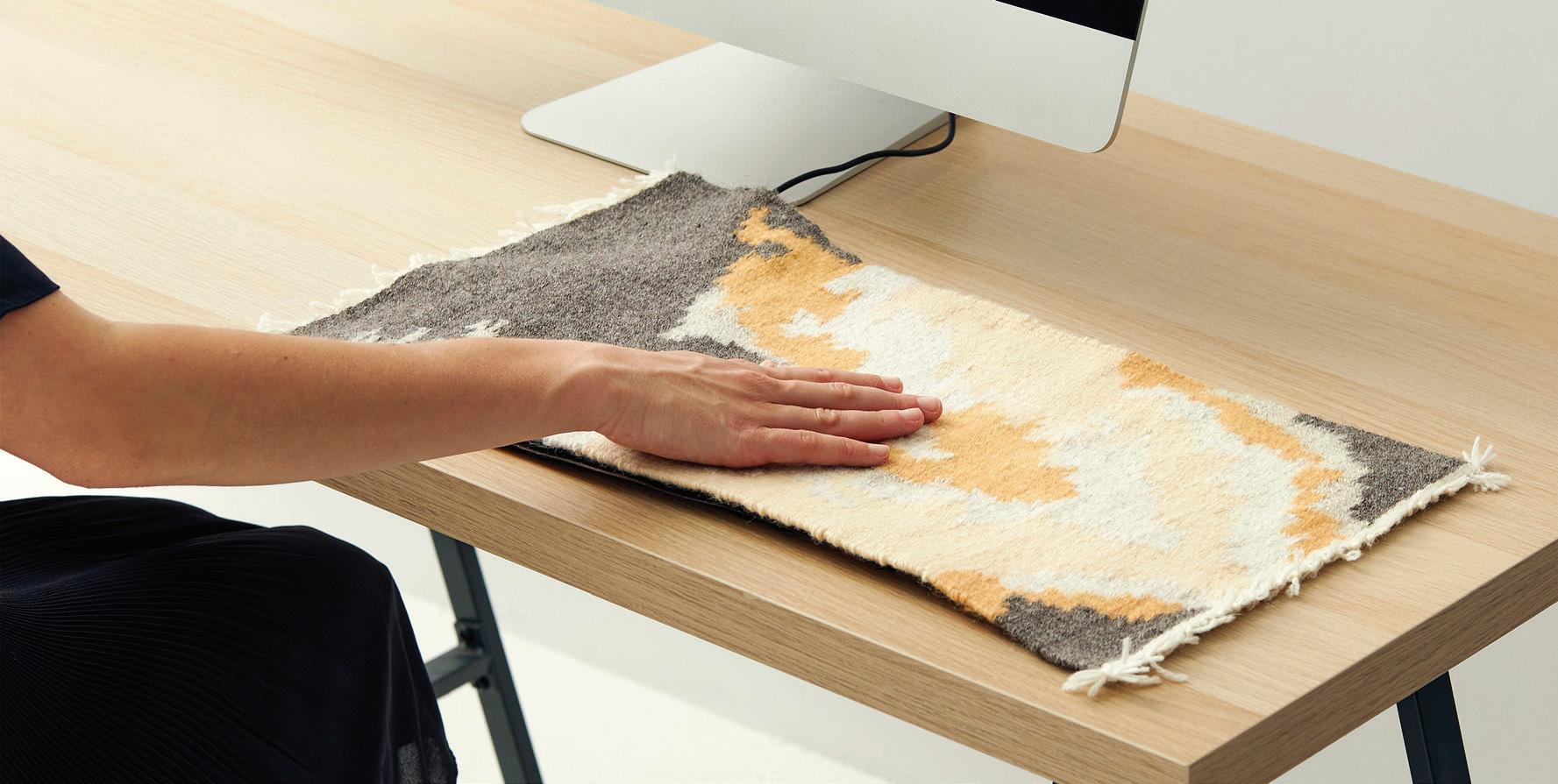 A woven bio-based touchpad (top) created from a conductive biomateral (bottom right) created using a variety of natural materials. A PCB attached to insulative and conductive biomatierals.
