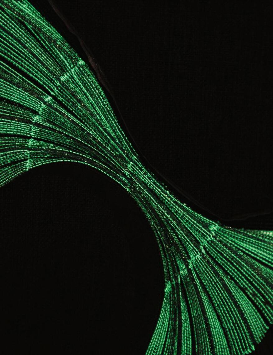Those in Glasshouses is the first in a series of three collaborative works made by Icelandic artist and musician Dettifoss Bergmann and Scottish Textile artist Emma Shannon. Their work explores the interactions between traditional craft and wearable technology in a fun and playful way for use in performance and education. Those in Glasshouses was inspired by Emma’s first digital photograph, taken in 2004, of the roof of Queens Park Glasshouse in Glasgow. Using only waste fabric sourced locally, the piece was hand embroidered and painted, recreating the photograph in 2D then brought back into 3D on the body. Using five meters of fully programable LEDs embedded seamlessly, this concept is brought into the modern world as a soft, wearable sculpture. Two companion pieces are in production for a performance at the Reykjavik Winter Lights Festival in February 2025. All three garments will be embedded with different soft sensors that react with the perfomers movements and will be accompanied by a new musical composition by Dettifoss. They are currently working with a technician to develop battery packs made from discarded Ecigarette lithium batteries to power these works in a more sustainable way. Those in Glasshouses has been shown at Erlendur Fashion Week Iceland and at the Icelandic Textile Lab in Blönduós.