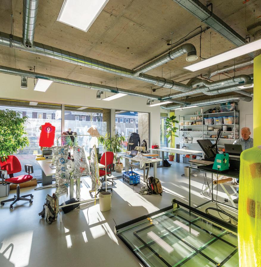 (Top) The exterior and interior of the Fashion Tech Farm in Eindhoven, The Netherlands. (Left) some of the tools. (Right) The work and exhibition space, including some of the current e-textile projects.