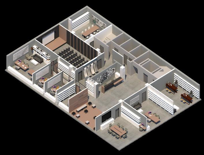 Photography and graphic design are two different creative fields but they have a lot in common. There are two traits that caught my eye, the use of pixels and the importance of composition. Digital photos are made up of pixels. Each individual pixel has a purpose and expresses a fraction of a whole image. When a group of pixels are joined together, we see an entire image. Therefore, pixels are multifunctional. Capturing photos as well as designing graphics requires the use of composition. Composition is done to achieve balance and a sense of order that is both appealing and comprehensible. The concept for my design follows the inspiration of pixels and composition. tried to incorporate the visual characteristics of pixels into the furniture designed and the artwork chose to place on the walls. applied the concept of multi-functionality and developed it through the technique of designing furniture with multiple uses. I created pieces that can be used in more than one way, similar to pixels, to cater to an even bigger application. For example, the sofa designed for the library doubles as a bookshelf. Some of the seating and tables are modular and can be joined together to create a bigger seating area. Another example is the photography studio, which can not only be used as a professional space to take photos, but can also double as a classroom so students can come and view the process. Mesh is a significant material used in my design. chose this material because of its resemblance to the concept of pixels; it is a group of perforations joined together to create an interesting pattern and to provide partial transparency. The overall look of the furniture and the artwork, as well as the mesh panels, reflect various visual aspects of pixels. In order to support the concept of composition, based the layout of the rooms on the grid. The walls and furniture are assembled in grid patterns; even the wiring of the mesh panels are intertwined like grids. Everything is laid out to achieve a sense of balance, order, focus and hierarchy, just like the grid of a composition. The goal of the design is similar to the goal of a graphic layout, to provide an attractive and comprehensible environ-