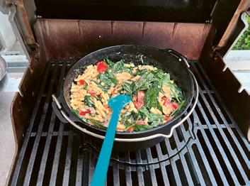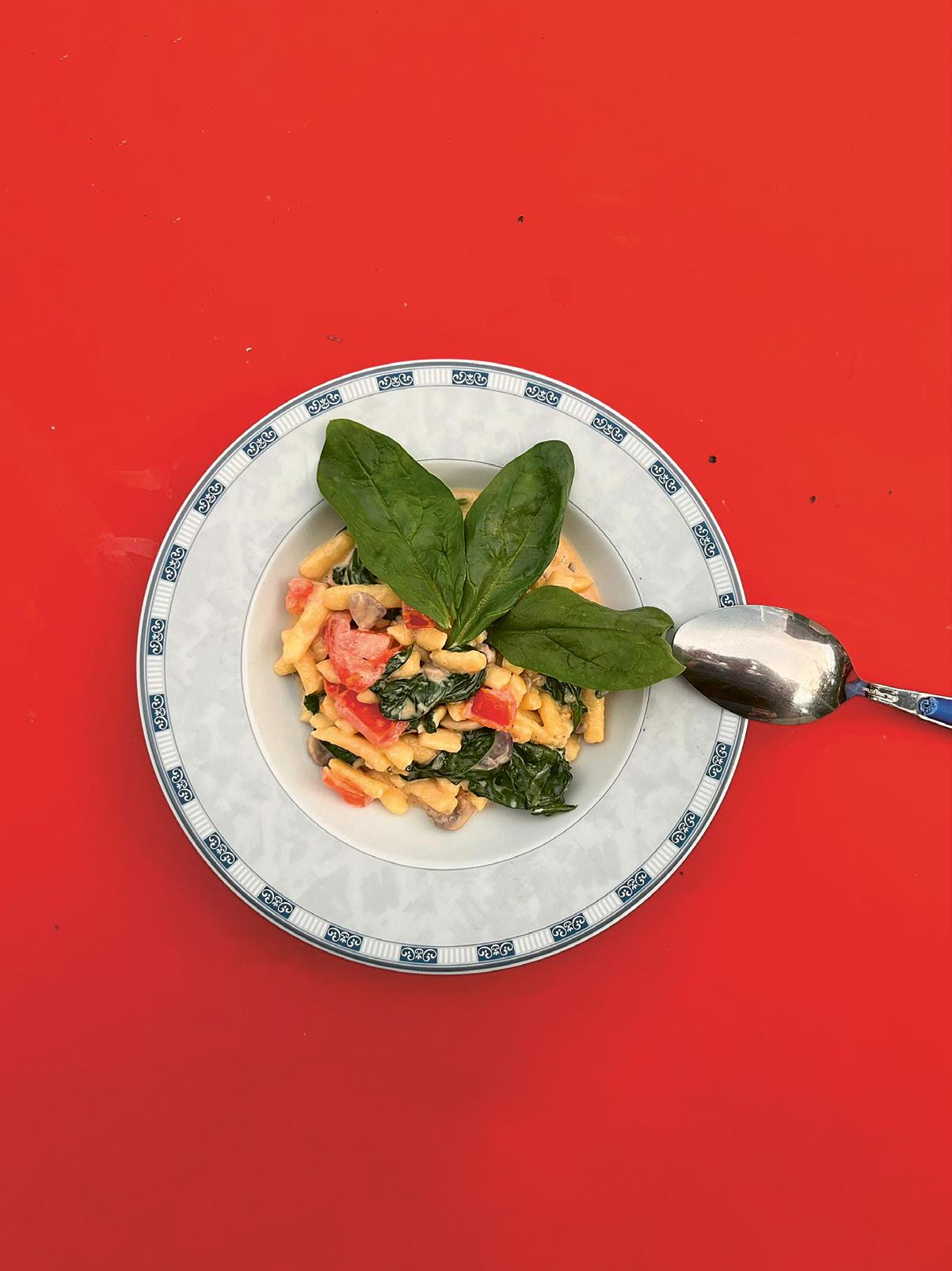 5. Vous pouvez maintenant ajouter les spätzli au mélange dans la poêle. Ajoutez également les tomates coupées en morceaux et les épinards. Ne vous étonnez pas, les épinards réduisent en cuisant.